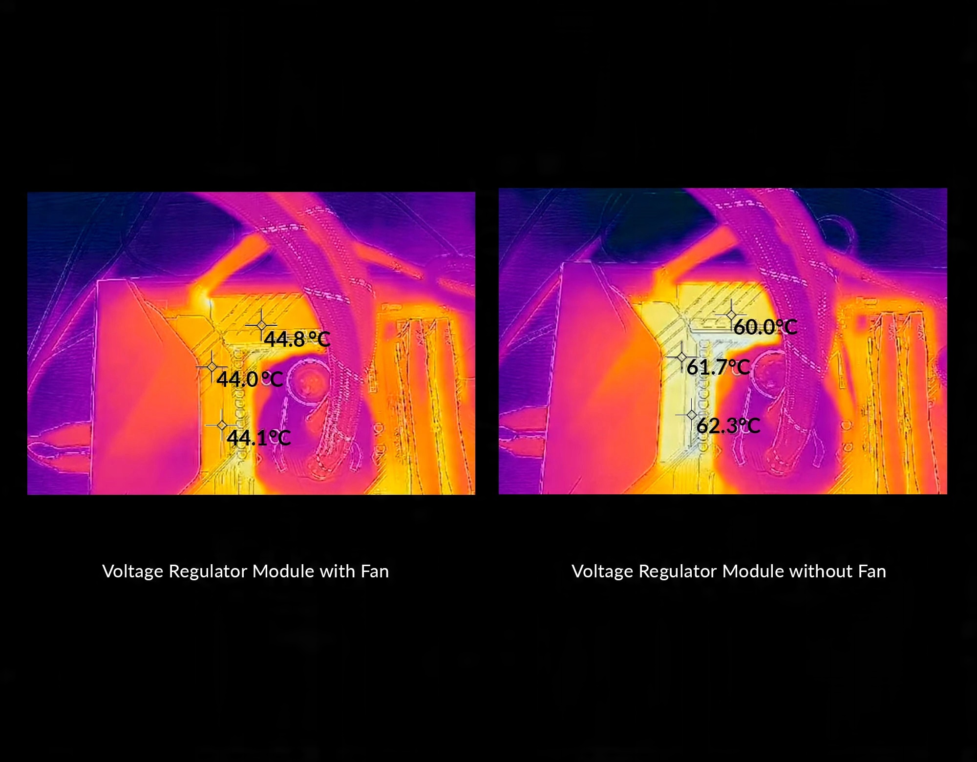 Вентилятор управляется ШИМ и может охлаждать трансформаторы напряжения и основание. область почти незаметно до 15 ° C. Именно это особенно эффективно в сценариях разгона, недостаточном охлаждении VRM или в случаях с плохим потоком воздуха, который допускает постоянные высокие нагрузки. Если доступно достаточное охлаждение VRM, его можно отключить по желанию.