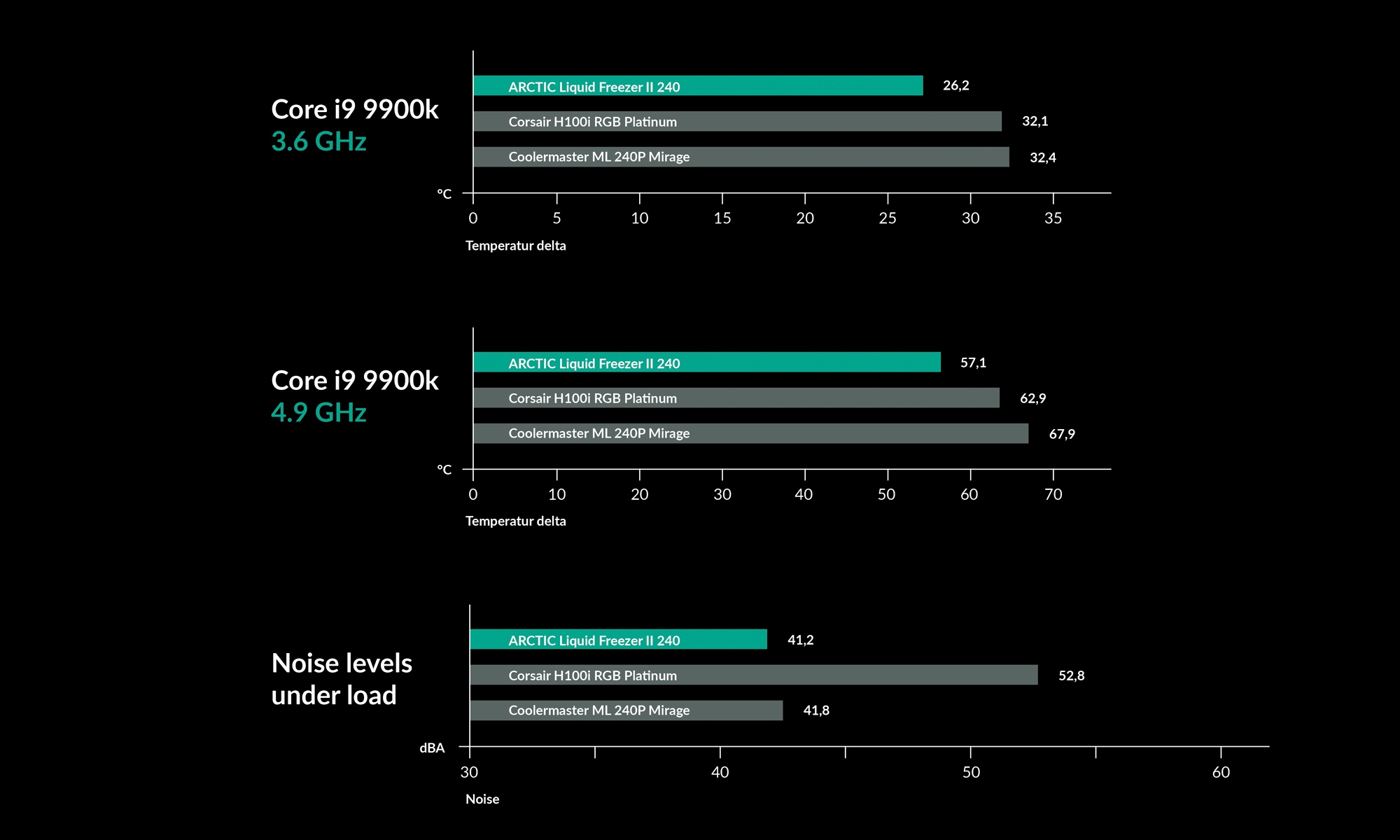 В отличие от большинства производителей универсальных систем жидкостного охлаждения, Arctic использует радиаторы толщиной 38 мм и высокую плотность ребер. Это позволяет использовать больше воды в контуре и значительно увеличивает поверхность охлаждения. Вода имеет гораздо более высокую теплоемкость, чем алюминий или медь. Это приводит к более медленному повышению температуры и снижению температуры на 5 °C в ограниченном по времени турборежиме современных процессоров.