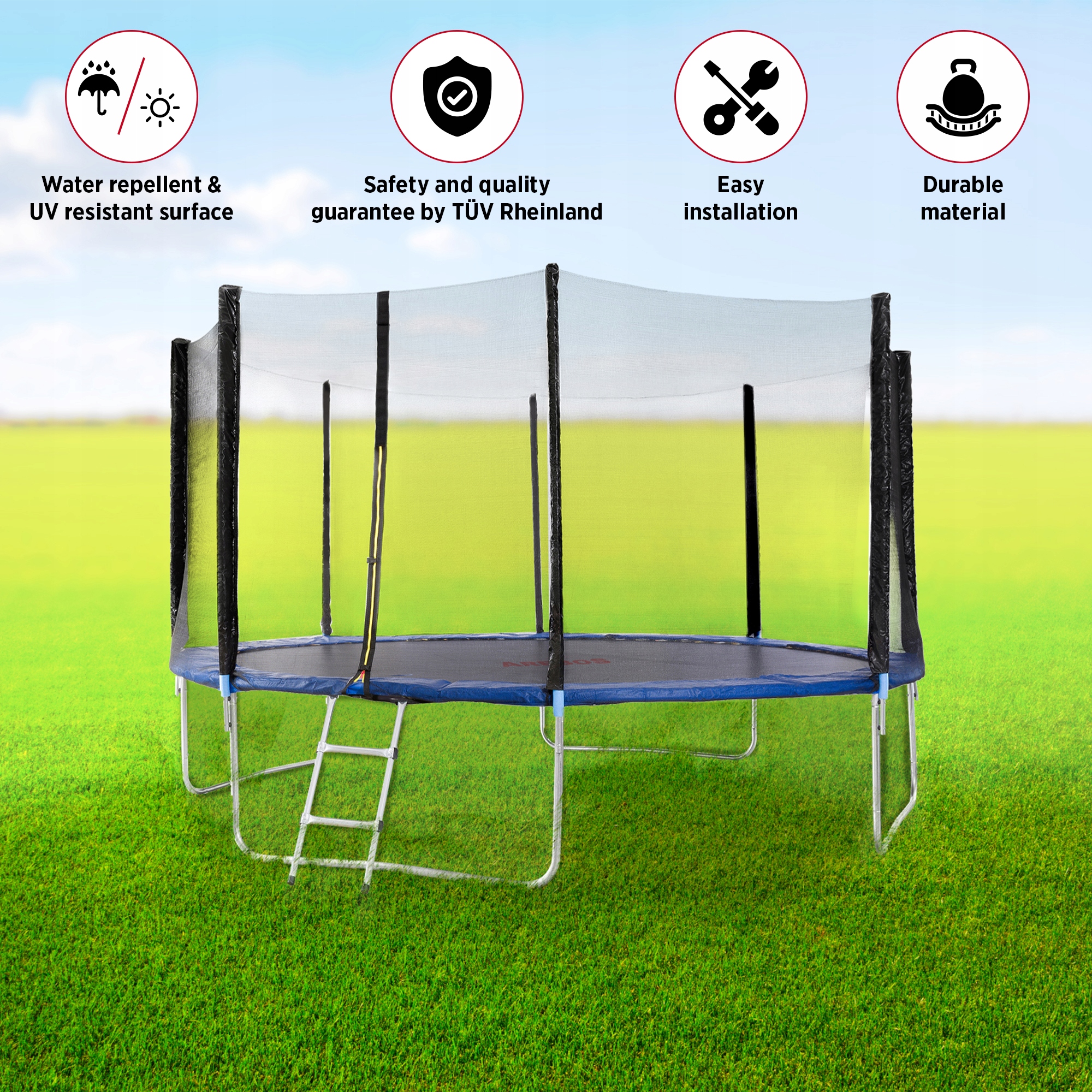 Устойчивая к ультрафиолетовому излучению и водонепроницаемая поверхность из ПВХ плотностью 310 г/м², а также пена EPE толщиной 20 мм защищают батут как в солнечные, так и в дождливые дни. Качественные швы защищают чехол от разрывов при частом использовании.