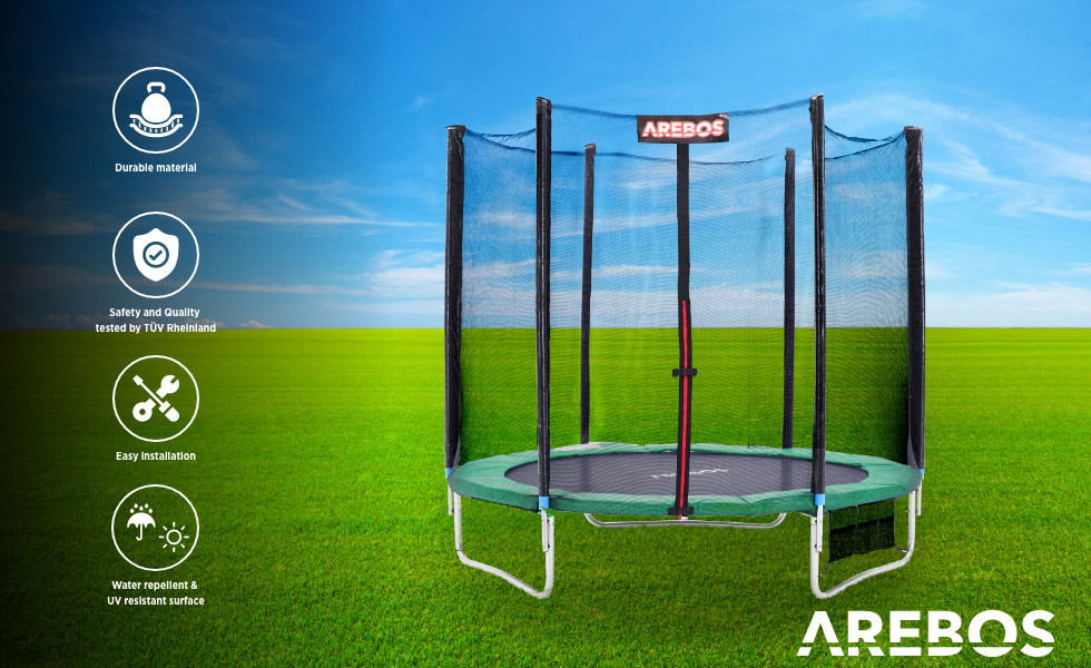 Защитная кромка батута AREBOS надежно защищает от травм при прыжках на батуте. В частности, пружины полностью закрыты для защиты от серьезных травм.