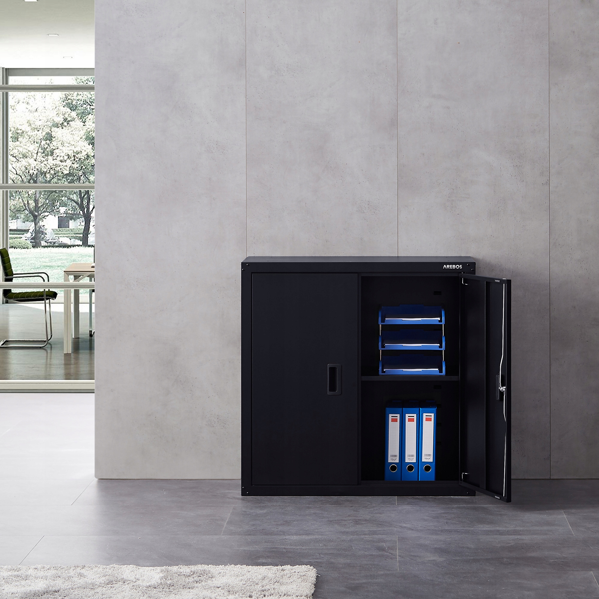 Этот шкаф доступен в виде комплекта для самостоятельной сборки и может быть установлен быстро и легко. В прилагаемом руководстве пошагово описана установка, поэтому вы сможете установить шкаф в кратчайшие сроки. Большим преимуществом этого шкафа для документов от AREBOS является то, что его можно закрепить на стене благодаря небольшому занимаемому пространству и небольшому весу.