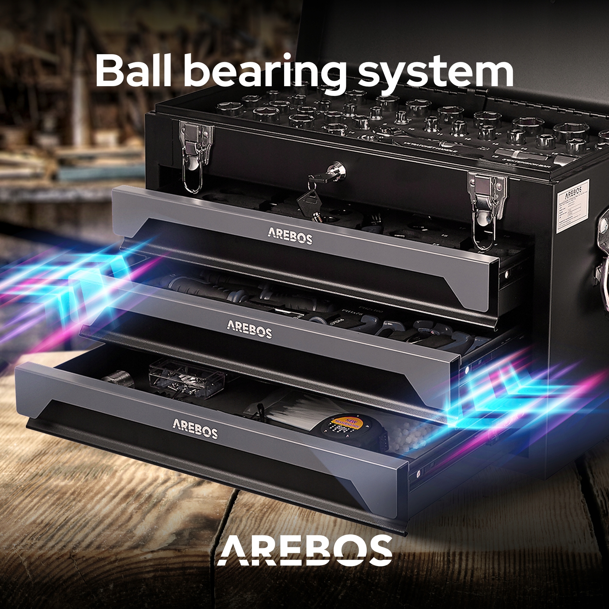 Кейс для мастерской AREBOS не только концентрирует большое количество инструментов в одном месте, но его компактный дизайн также экономит место, когда вам нужно его убрать. Ящики открываются и закрываются очень плавно, поскольку они работают на шарикоподшипниках.