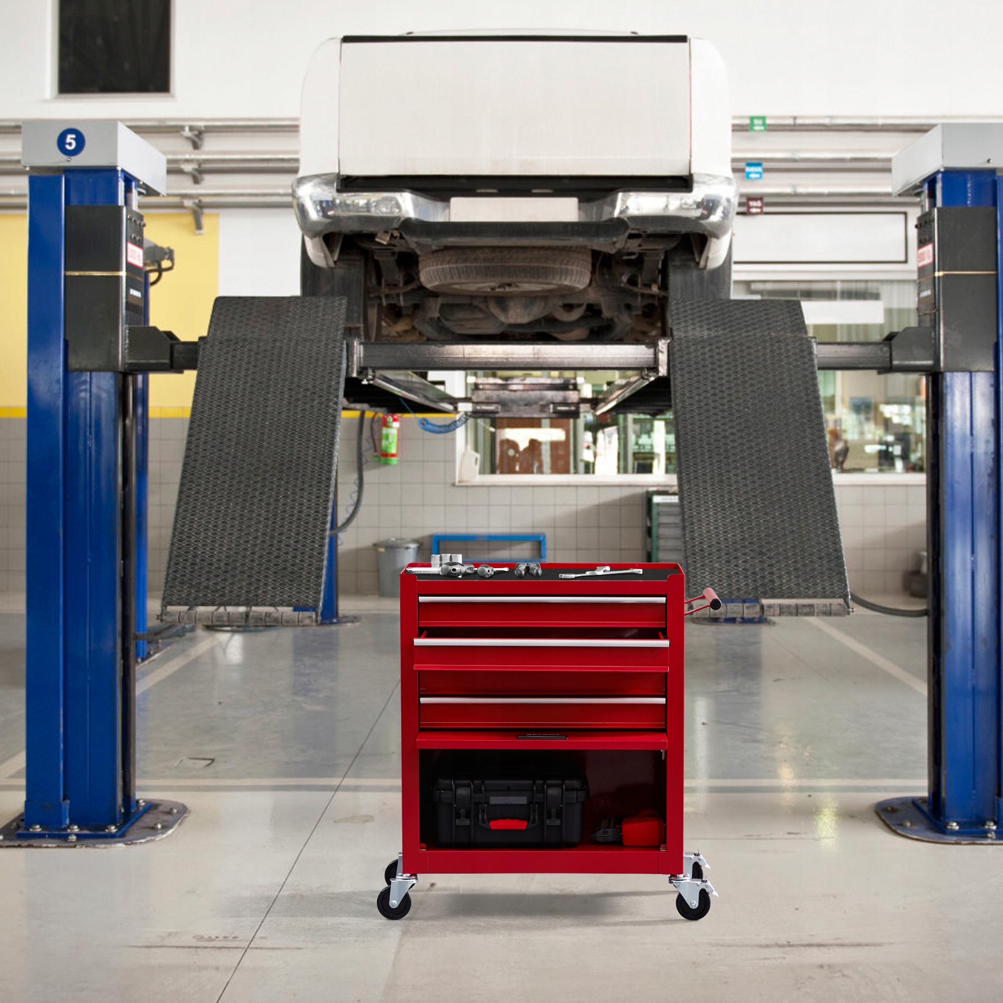 Ящики с шариковыми подшипниками позволяют плавно открывать и закрывать ящики. Кроме того, большие ящики с не -скользящими ковриками предлагают достаточно места для всего оборудования и сохраняют все инструменты в нужном месте.