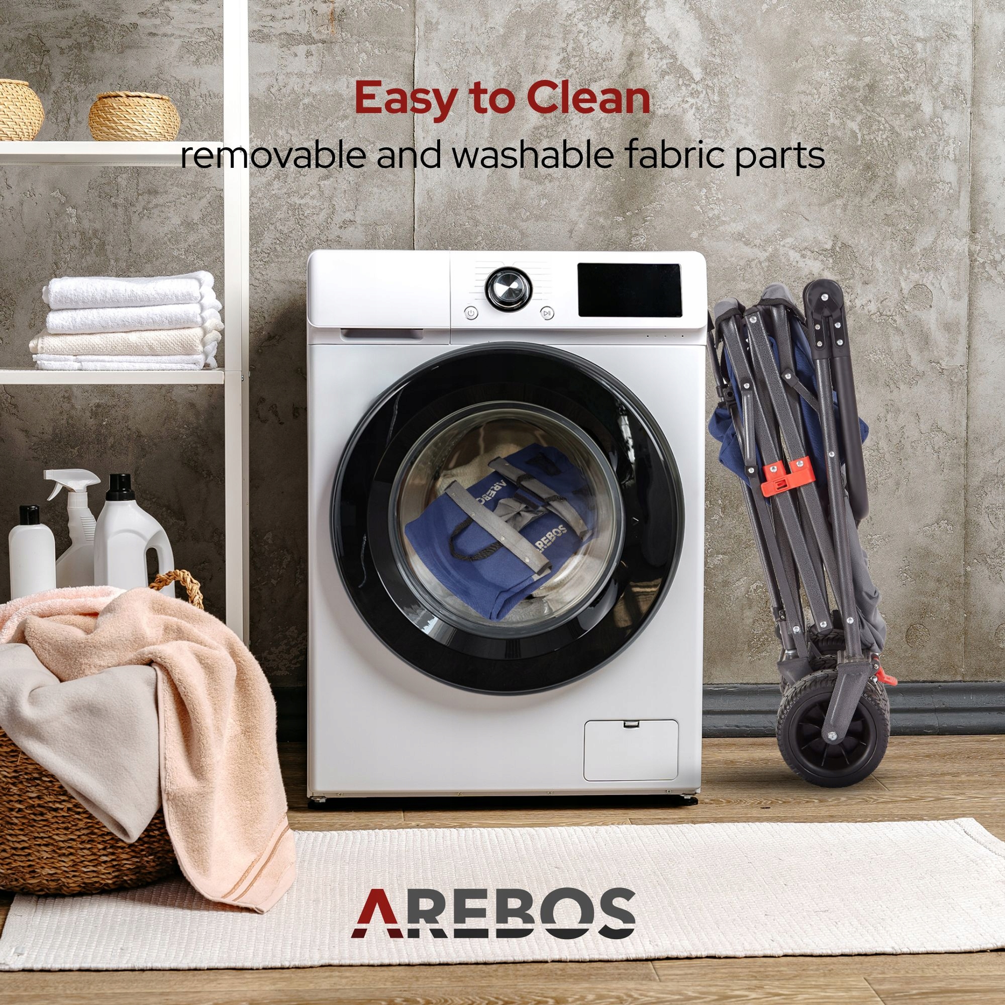 [Комфорт и функциональность] Ручная тележка Arebos изготовлена из твердого абразивного нейлона 600D Oxford и обеспечивает защиту от прямых солнечных лучей, дождя и грязи. Все части ткани удаляются и могут быть промыты, что упрощает очистку и уход за коляской и способствует долговечности продукта.