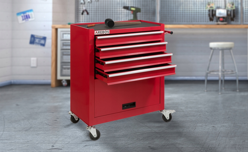 [ИДЕАЛЬНО ОБОРУДОВАННО] Тележка для инструментов AREBOS с 4 ящиками и большим пространством для хранения | Изготовлен из прочной стали | Прочная и устойчивая к царапинам столешница | Ящики с шарикоподшипниковыми направляющими и противоскользящими ковриками гарантируют, что инструменты останутся на месте и не будут дребезжать при перемещении тележки.