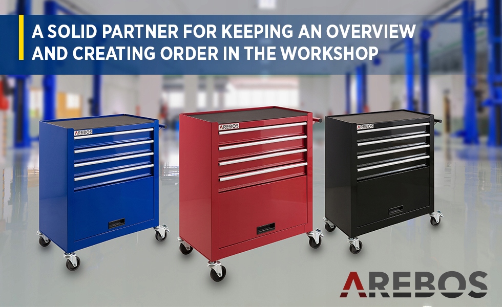 - Наша тележка для мастерской AREBOS оснащена в общей сложности 4 выдвижными ящиками и большим пространством для хранения.