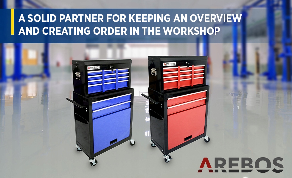 Тележка для мастерской AREBOS предлагает достаточно места для хранения благодаря восьми ящикам разных размеров, отделению для хранения и большому шкафу. Благодаря этому вы можете хранить широкий спектр инструментов и аксессуаров в наглядном и организованном виде, чтобы у вас всегда был быстрый доступ к необходимым инструментам.