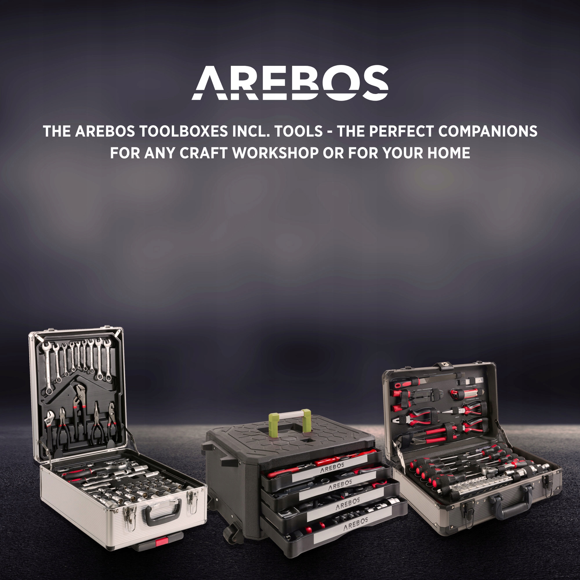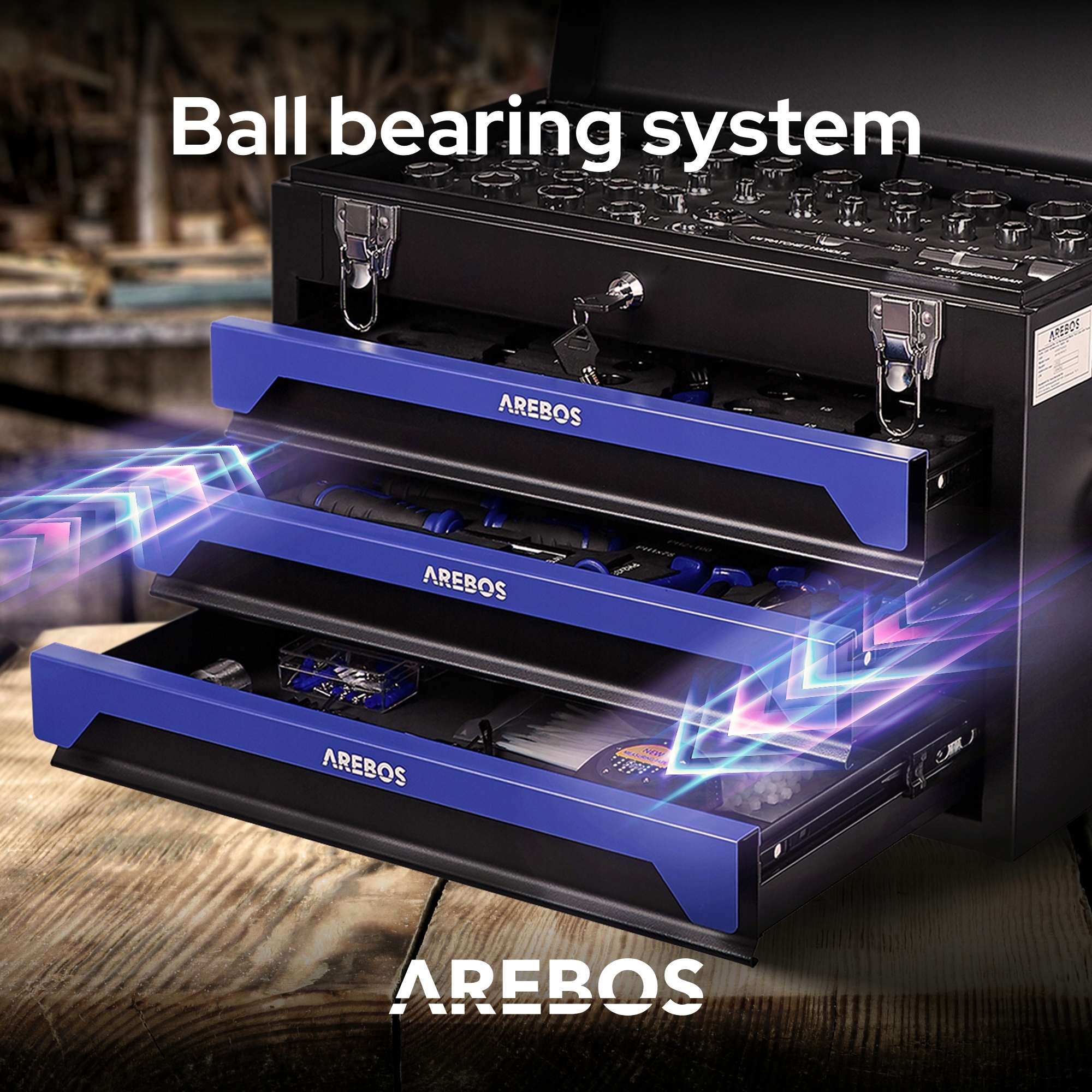 Кейс для мастерской AREBOS не только концентрирует большое количество инструментов в одном месте, но его компактный дизайн также экономит место, когда вам нужно его убрать. Ящики открываются и закрываются очень плавно, поскольку они работают на шарикоподшипниках.