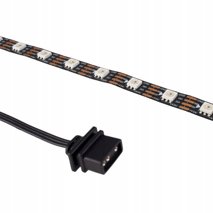Адресная светодиодная лента с диодами WS2813 с кабелем и вилкой, предназначенной для работы с 3-контактным разъемом ARGB (5В) материнской платы компьютера или с совместимым контроллером вентилятора.