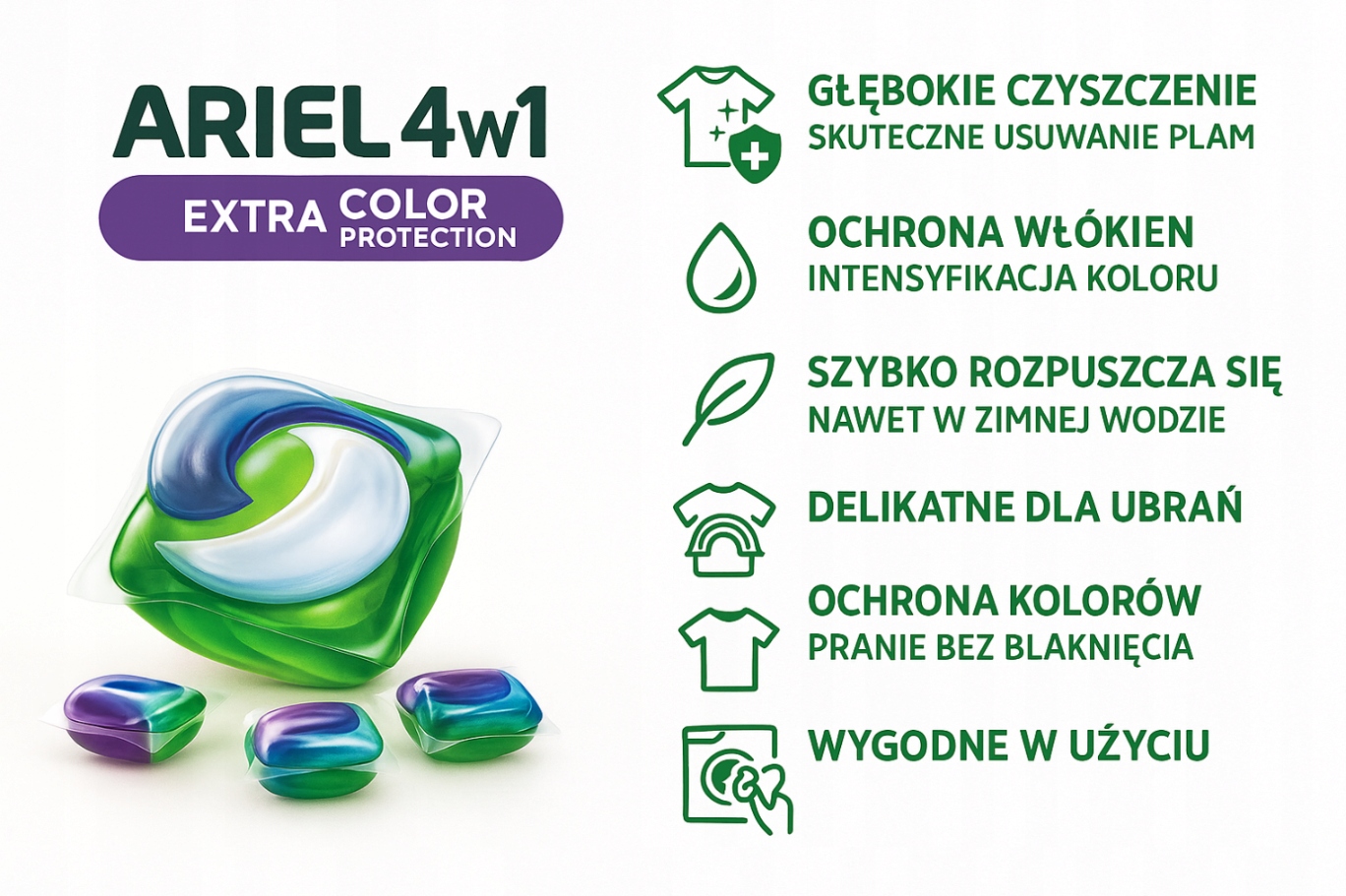 Ariel 4in1 PODS Extra Color Protection — это усовершенствованные капсулы, предназначенные для ухода и защиты цветной одежды. Благодаря инновационной формуле они обеспечивают эффективное удаление пятен, усиление цвета, защиту волокон и глубокую чистоту — и все это в одной удобной дозе.