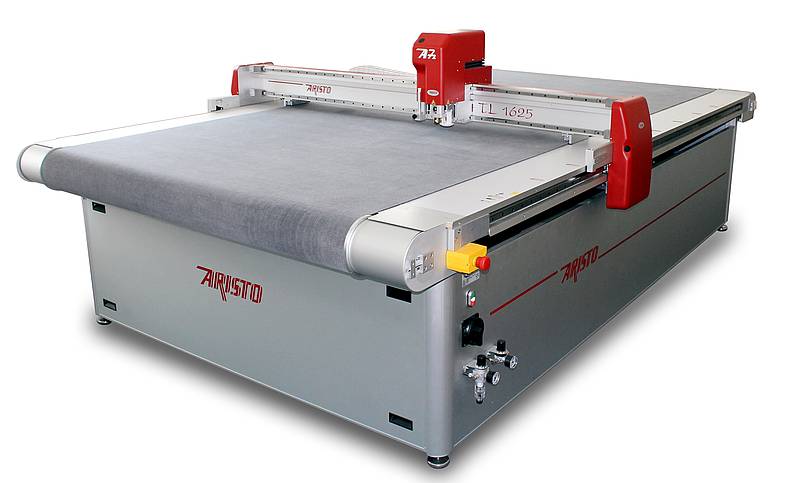 Предмет аукциона — новый настольный режущий плоттер Aristomat TL1625 с рабочей зоной 1600 на 2500 мм, оснащенный осциллирующей головкой MULTIHEAD A5z, позволяющей резать даже самые твердые материалы, в том числе графитовые пластины. со стальной проставкой.