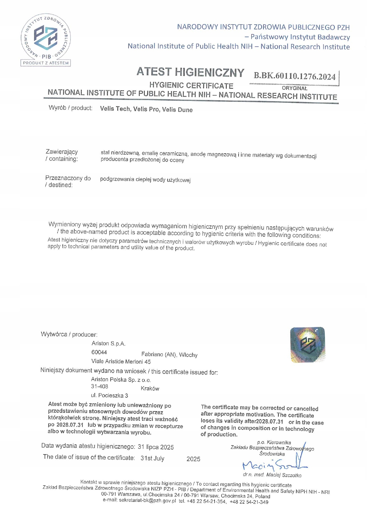 Продукт имеет гигиенический сертификат, выданный Национальным институтом общественного здравоохранения – Национальным институтом гигиены (NIZP-PZH), подтверждающий, что он соответствует всем требованиям безопасности при использовании и контакте с водой, предназначенной для потребления человеком.