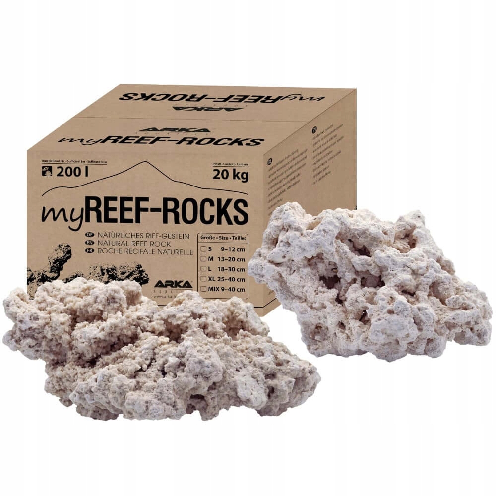 Arka Aquatics myReef-Rocks— природный камень ископаемого происхождения для строительства рифов. Он не содержит вредных веществ и органических загрязнителей. Сильно пористый. Упаковано в коробки по 20 кг, содержащие камни размером S, 9-12 см.