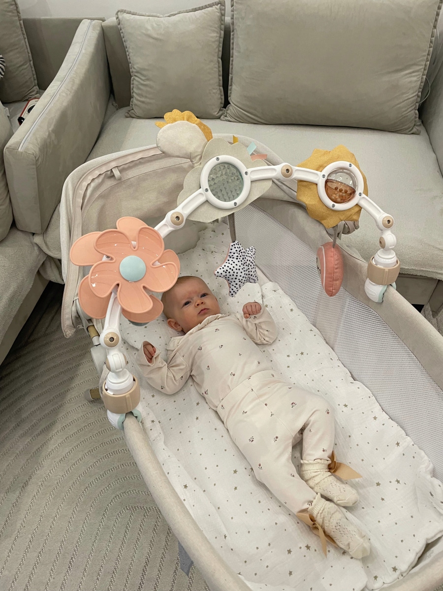 Пока ребенок лежит на спине, игрушки должны быть в пределах досягаемости, а малыш может смотреть в звездное зеркало, играть с прорезывателем или рассматривать игрушки, висящие перед ним.
