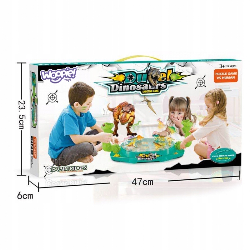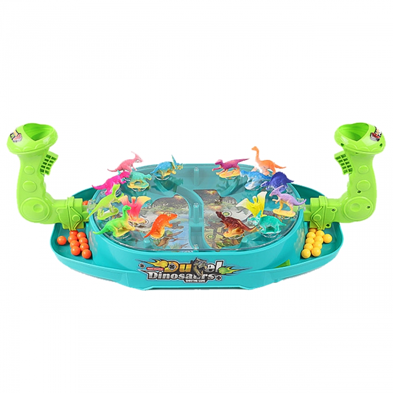 Битва динозавров — аркадная игра от бренда Woopie. Эта стрелялка по динозаврам для двух игроков значительно улучшит ваши навыки координации. Разместите динозавров на доске в соответствующих местах. Бросайте шарики в держатель и нажимайте на спусковой крючок, чтобы убить динозавров. Победителем становится тот игрок, который быстрее сбьет шариками динозавров с доски противника. В набор входит игровое поле с пластиковой крышкой, предотвращающей выпадение шариков, 16 разноцветных динозавров и 24 шарика двух цветов.
