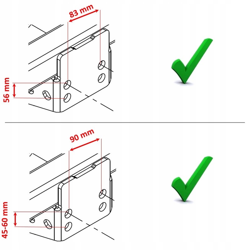 подгоняет все фургоны с оригинальным шариком, прикрепленным к задней балке для 4 винтов, и ко всем автомобилям, оснащенным буксирным крючком с болтовым шариком, прикрепленным к двум винтам с расстоянием между 90 мм или 4 винтами с расстоянием между 83x56 мм.
