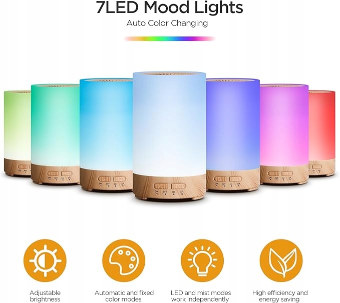【7 режимов освещения】: аромадиффузор имеет 7 разноцветных лампочек. Вы можете изменить семь цветов или зафиксировать фиксированный цвет. Лампы можно включить в качестве ночника в любое время. Прекрасный подарок для семьи и друзей. Нажмите и удерживайте кнопку в течение 3 секунд, чтобы выключить свет.