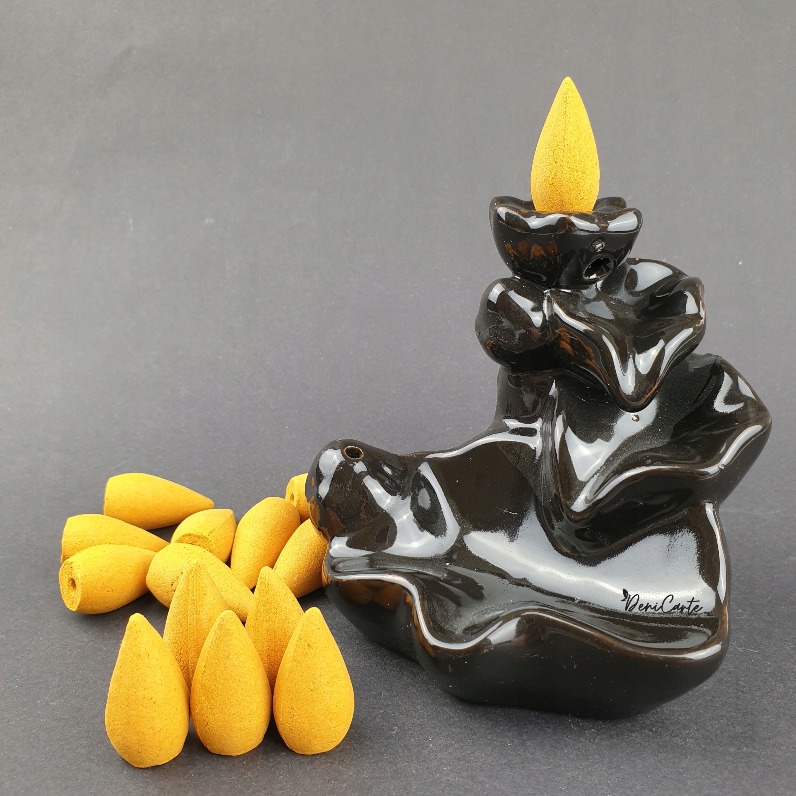 Просто зажгите на кончике ароматическую палочку конической формы с обратным потоком, поместите ее на ароматическую горелку, и дым благовоний, тяжелее воздуха, будет стекать вниз по извилистым канавкам, создавая потрясающий эффект для глаз.