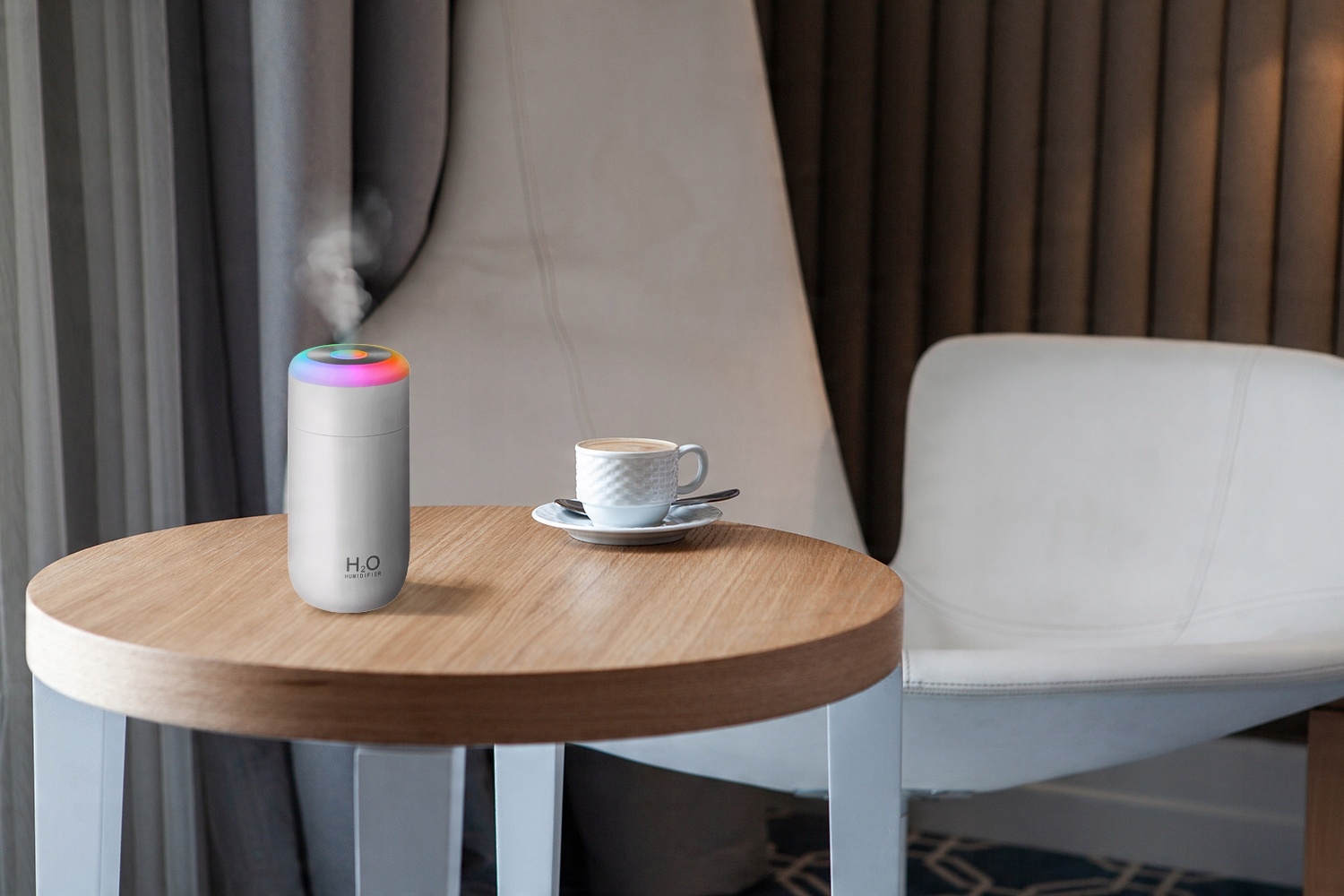 Увлажнитель воздуха имеет современный дизайн, напоминающий термокружка. Его с успехом можно использовать в качестве украшения квартиры.Благодаря компактным размерам он не занимает много места и поместится на любом письменном столе или тумбочке.