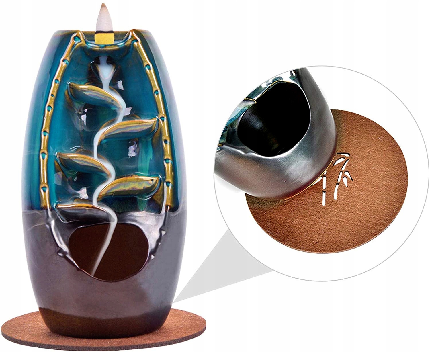 Дымчатый водопад отличается простой и элегантной структурой. В своей внутренней части он имеет пять выступов, по которым лениво стекает дым от зажженной ароматической палочки. При горении ароматическая палочка создает эффектный водопадный эффект струящегося дыма с обратным потоком «обратного потока».