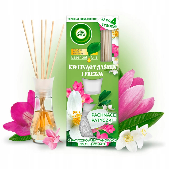 Ароматические палочки Air Wick Blooming Jasmine и Freesia входят в коллекцию Essential Oils, чьи ароматические композиции вдохновлены натуральными эссенциями фруктов, цветов и растений и создают уникальную атмосферу в вашем доме.