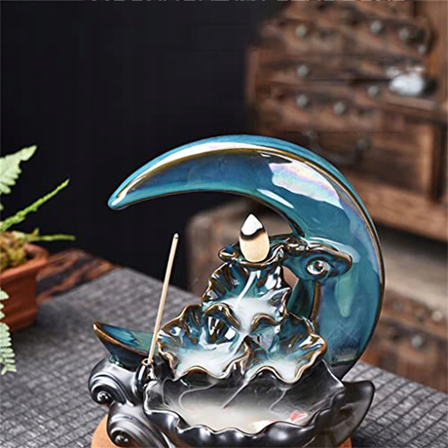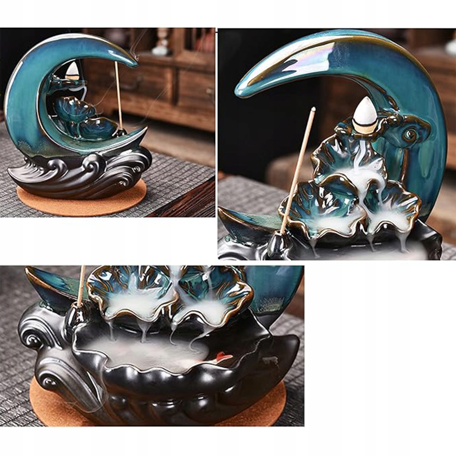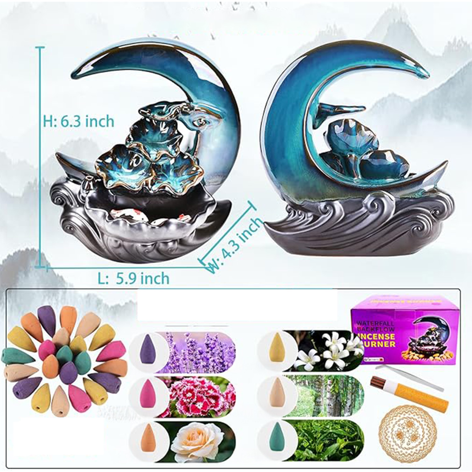 Курильница Cool Cascade имеет форму голубой луны, которая кажется восходящей на фоне прекрасного ночного неба. Он украшен цветами лотоса и волнами, создающими красивый вид, напоминающий водопад или капли росы.