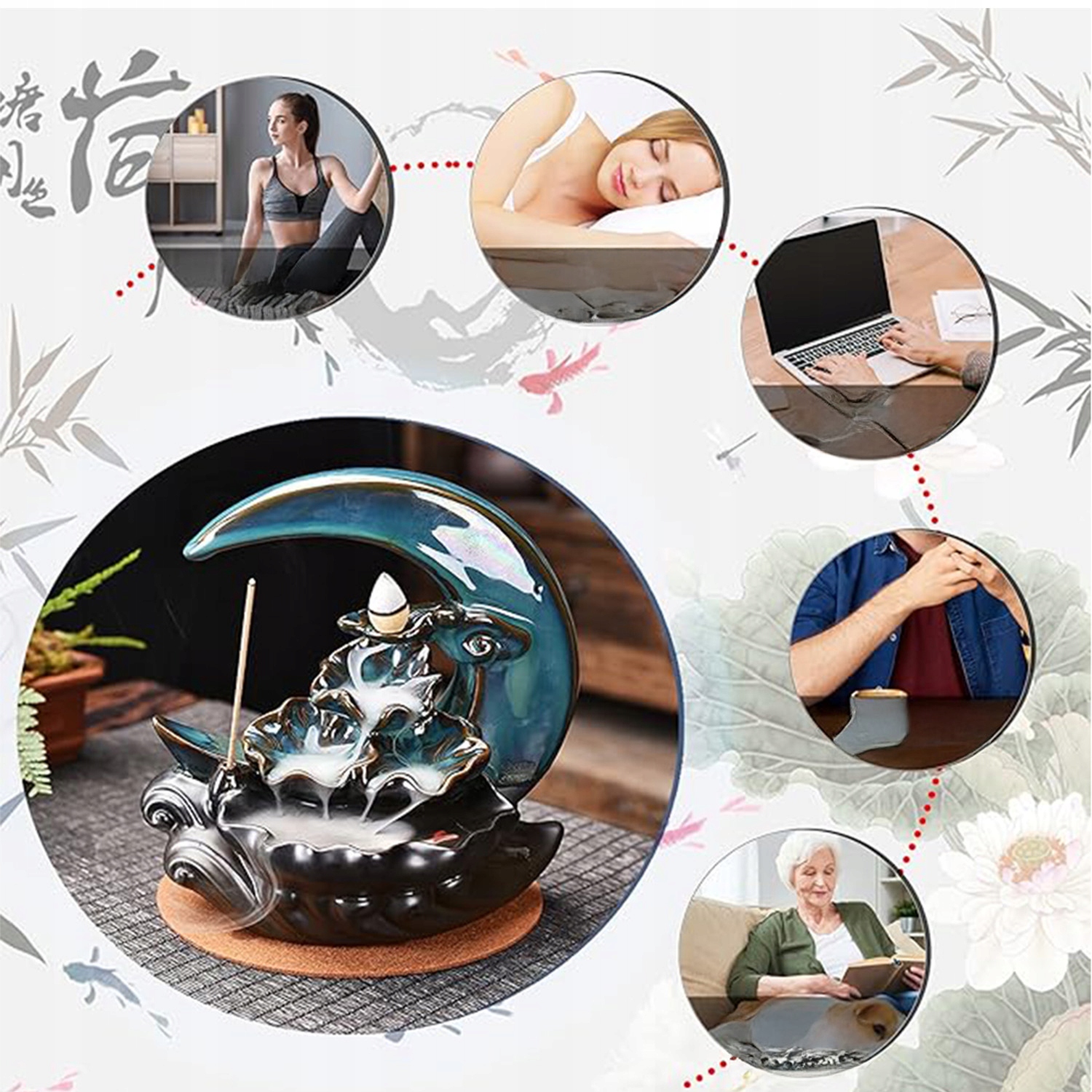 🌙ЛУННЫЙ ЦЕНТР ОБРАТНОГО ТОКА, КЕРАМИКА, ФОНТАННАЯ ГОРЕЛКА РУЧНОЙ РАБОТЫ С 100 КОНУСАМИ ОБРАТНОГО ТОКА, АРОМАТИЧЕСКИМ ПАЛОЧКАМИ, КОВРИКОМ, УКРАШЕНИЕ ДОМА С АРОМАТЕРАПИЯЮ🌙