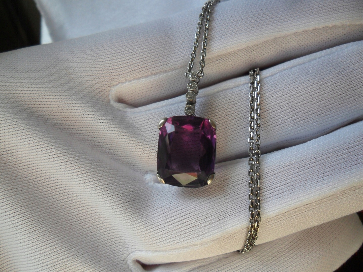 Ожерелье, сделанное в попытках 750 и серебряного - аметиста светильника. Украшение; Аметист с интенсивным фиолетовым цветом с размерами 1,41 х 1,16 см, высота около 6,9 мм. Алмазы в старом разрезе диаметром ок. 1,8 мм. Размеры ожерелья - 44 см. Длина Ланкушки, декоративная часть с длиной 2,3 см. Вес на ожерелье 7400 грамм. Условие, как на фотографиях. Аукцион относится к самому ожерелью.