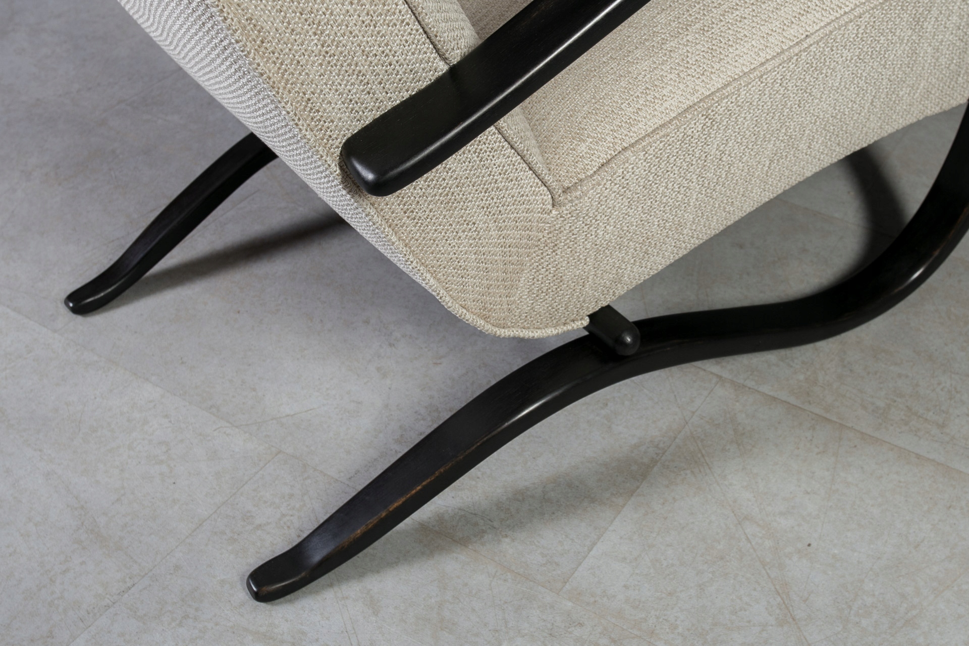 Кресло было профессионально восстановлено - рама из пчелиного бука была очищена и отделана традиционной лаком Shellac с воском, что придает ему теплый, атласный блеск. Обивка была полностью заменена - использовалась новая высококачественная ткань и новая пена. Оригинальная пружинная система сохранилась и находится в отличном состоянии.