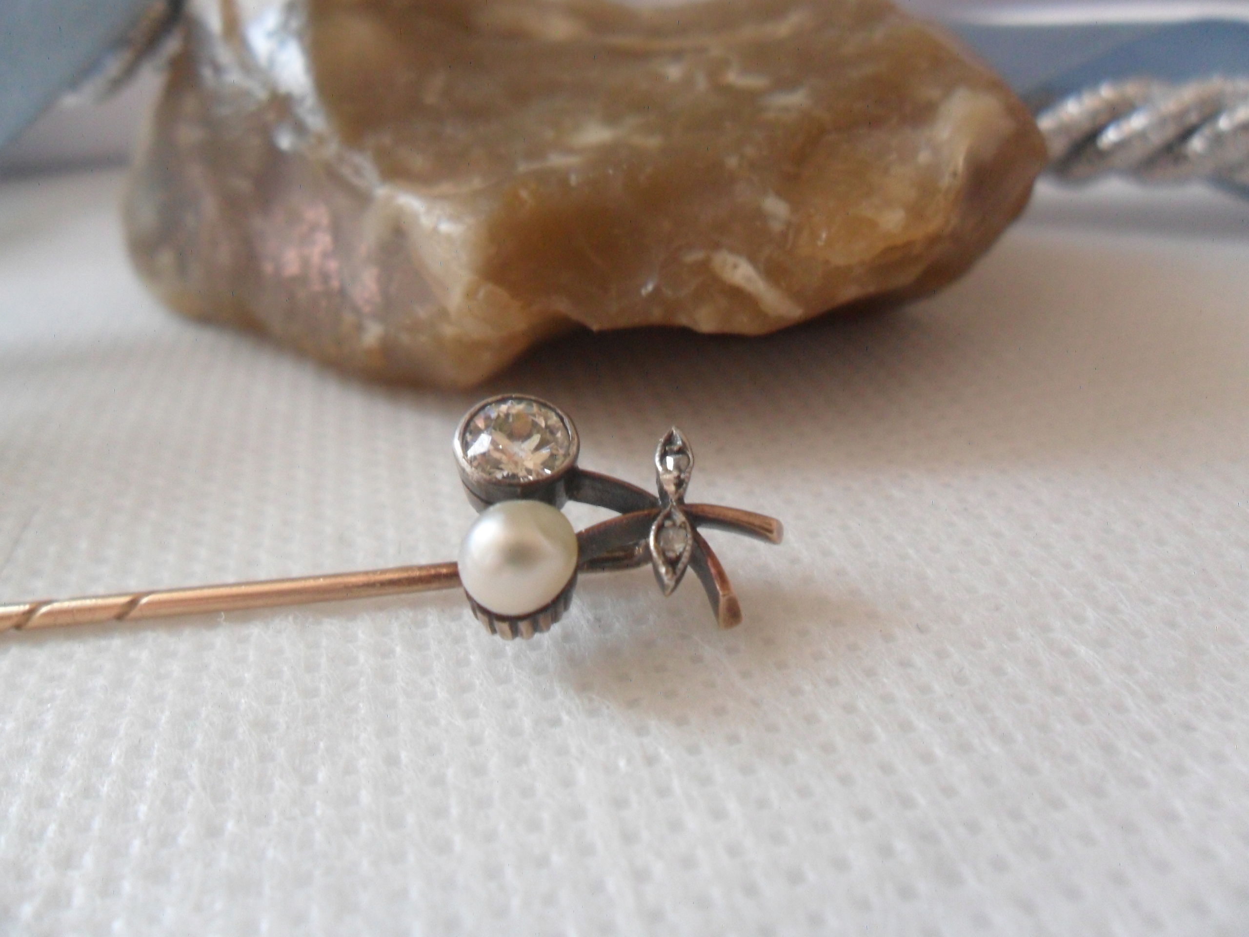 Серебро из золота и серебра - каменная оправа. украшение; Бриллиант старой бриллиантовой огранки, две бриллиантовые розетки и жемчужина диаметром 4 мм. Бриллиант диаметром около 5 мм, высотой около 2,5 мм, весом около 0,50 карата. Чистота VSI, Цвет Белый H. Размеры булавки – длина 8 см, вес 2200 грамм. Подпись золотом 585 пробы, подпись художника частично неразборчива. Состояние как на фотографиях.