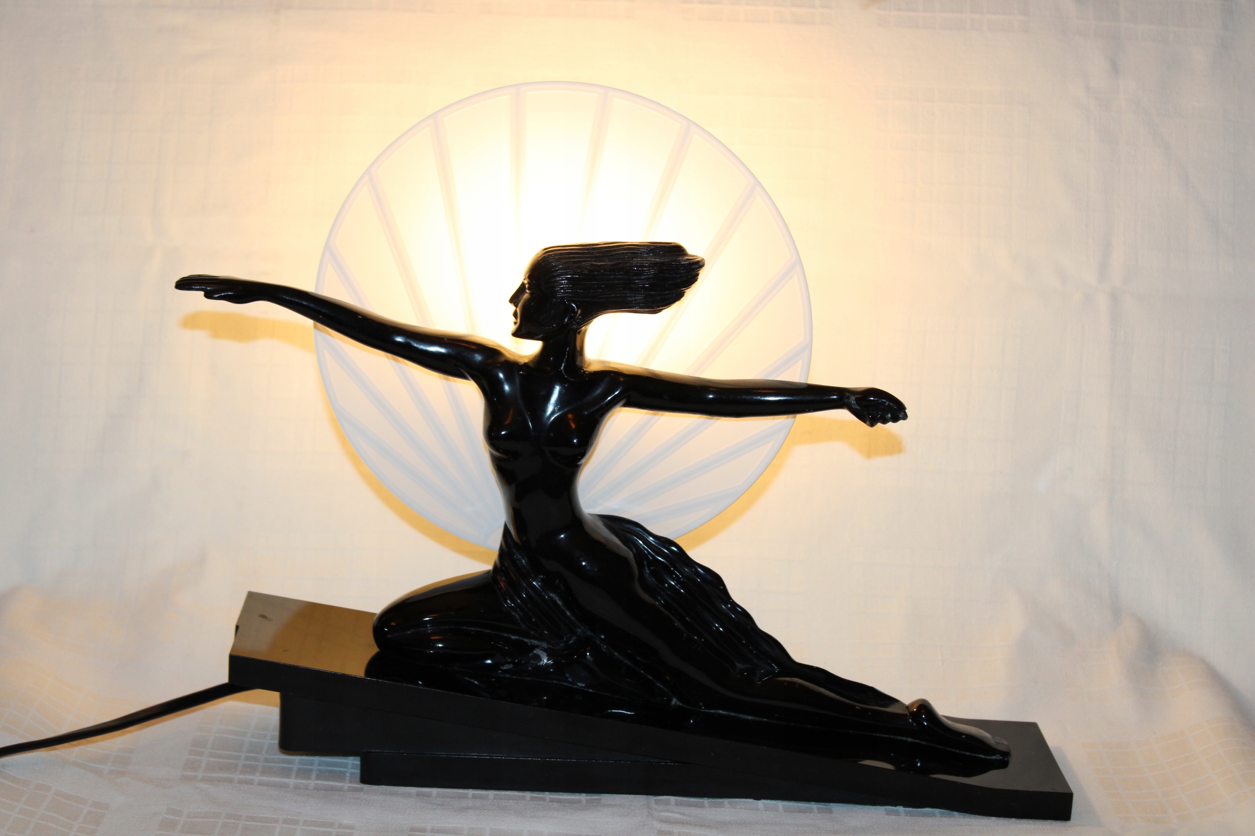 Светильник в стиле арт-деко. Фигурка танцующей женщины на бакелитовой подставке. Высота 22 см, размах рук 28,5 см, размеры основания 7,5 см х 34 см. Фигурка выполнена из немагнитного металла серебристого цвета, покрыта черной эмалью, на спине на высоте лопаток имеются отверстия с нитками, левая рука сжимается с отверстием. Между фигурой и лампочкой, прикрепленной к упомянутым выше отверстиям, находится белый круглый экран, рассеивающий свет. При включении лампочки на экране появляется рисунок веера. На последнем фото видна трещина на основании. Красивый, атмосферный светильник.