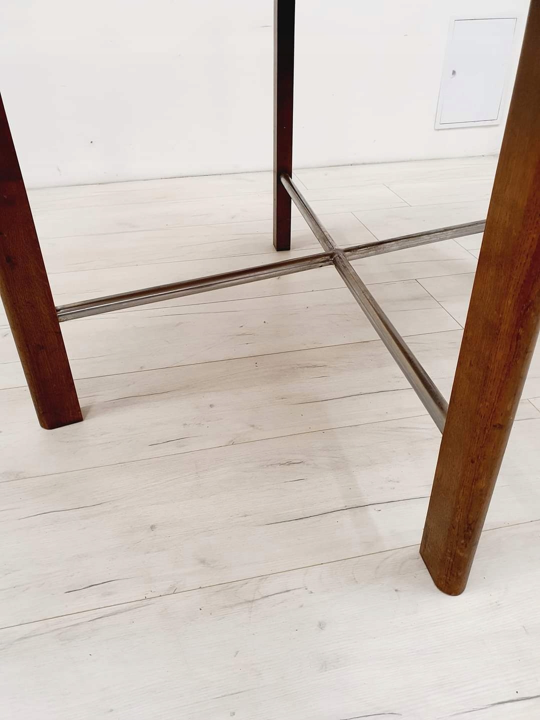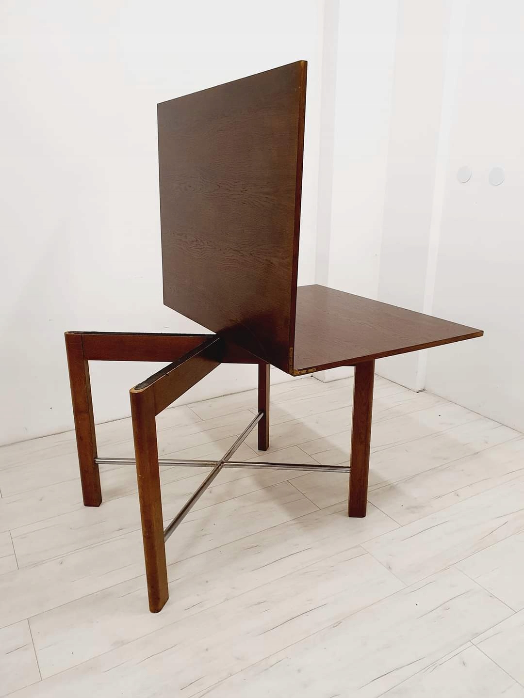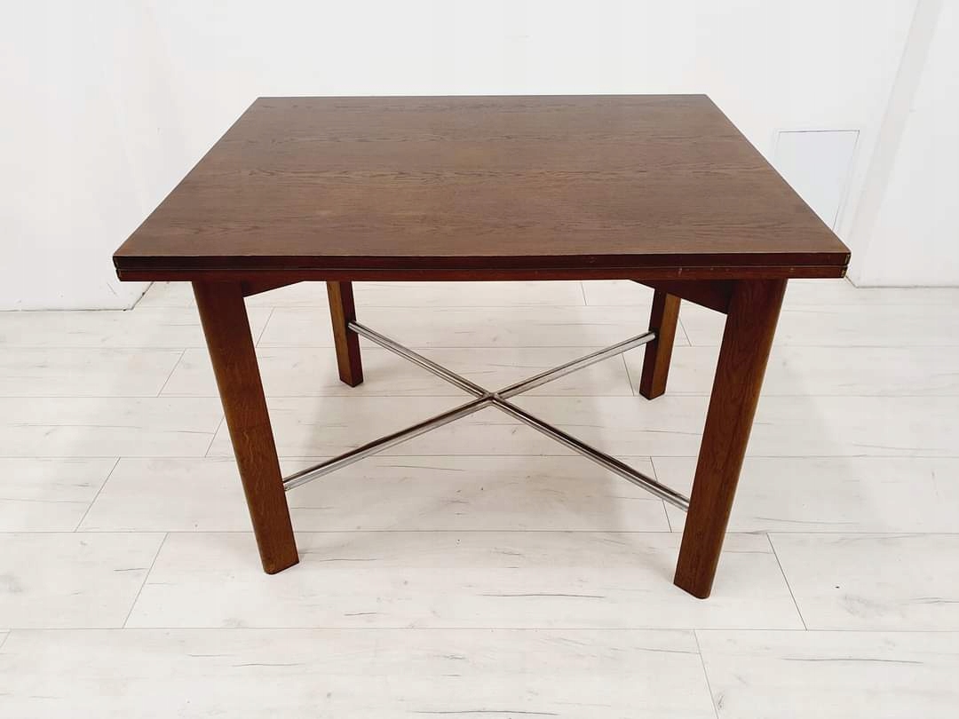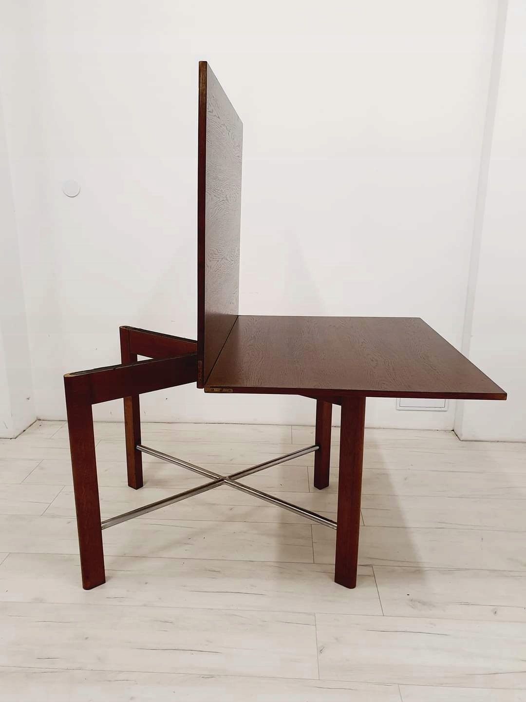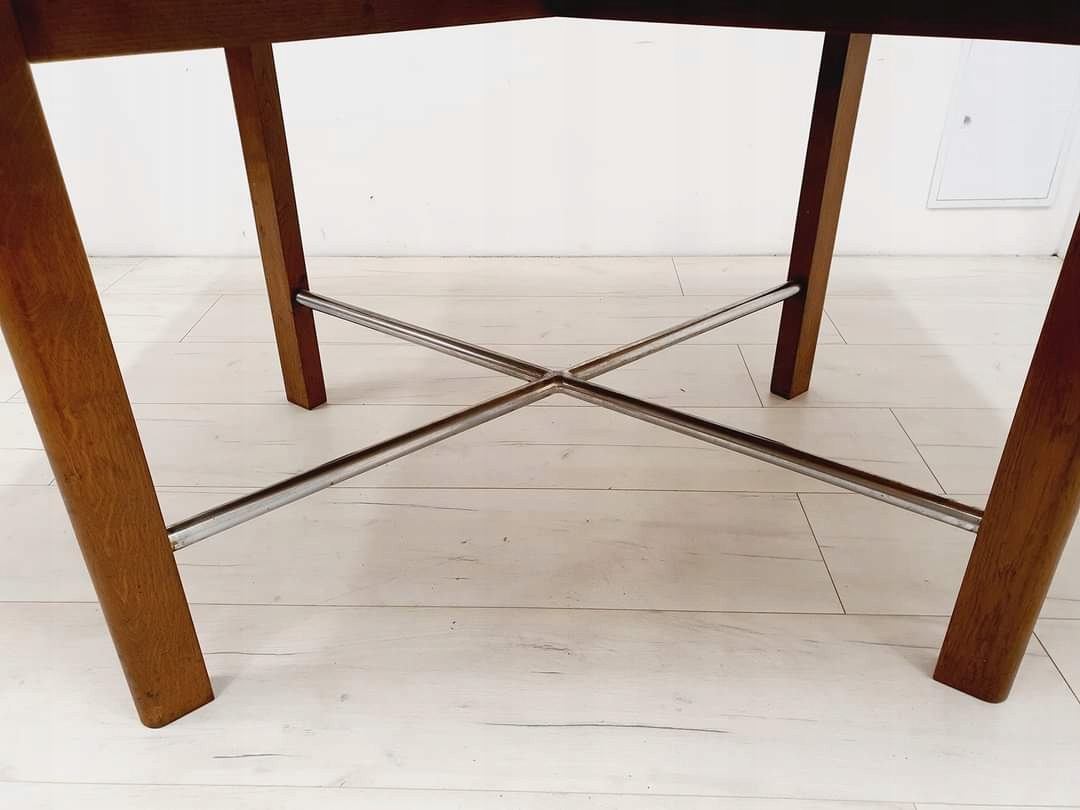 В каталоге он фигурирует со стульями, которые мы приобрели комплектом. Стол облицован дубом, стулья изготовлены из массива ореха. Это неудивительно, ведь данная модель стульев не предлагалась в дубовом исполнении и заказчик мог свободно конфигурировать комплект, а стол также мог сочетаться с хромированными стульями.