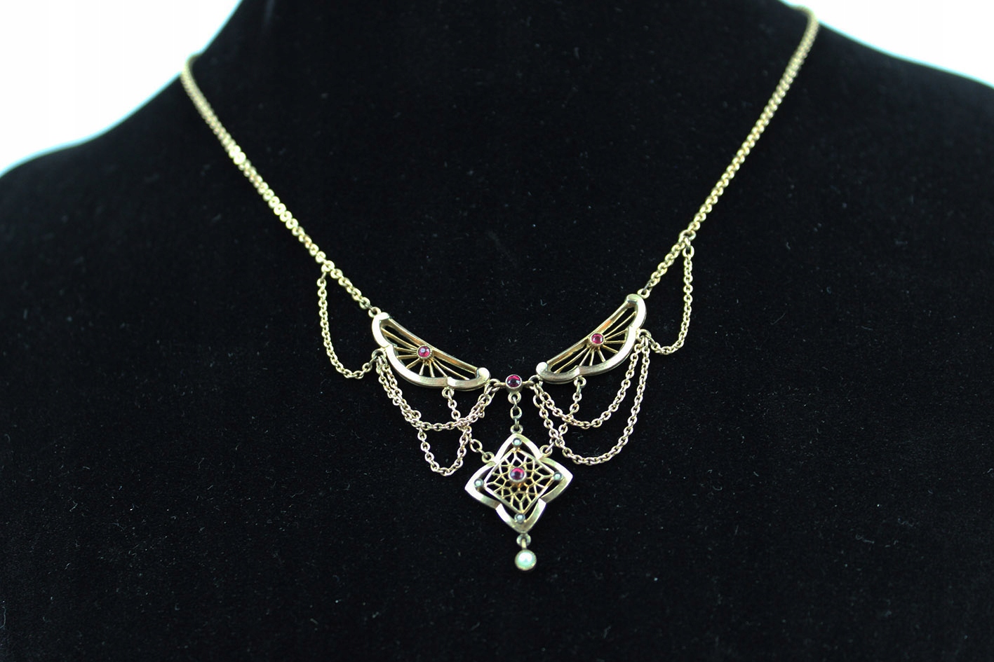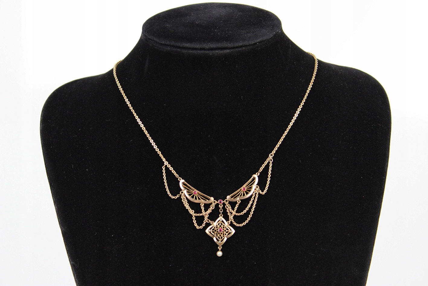 Исключительное ожерелье красоты с начала 20 -го века. Строительство в позолоченной латуни, сделанная в двойной технике. Центральный элемент открытых работ, богато украшенный и интимный рубин, грандиозное стекло и жемчуг. Двойное прикрепление ящика как для кофера, так и для принцессы. Все в очень хорошем состоянии с деликатной патиной. Размеры: