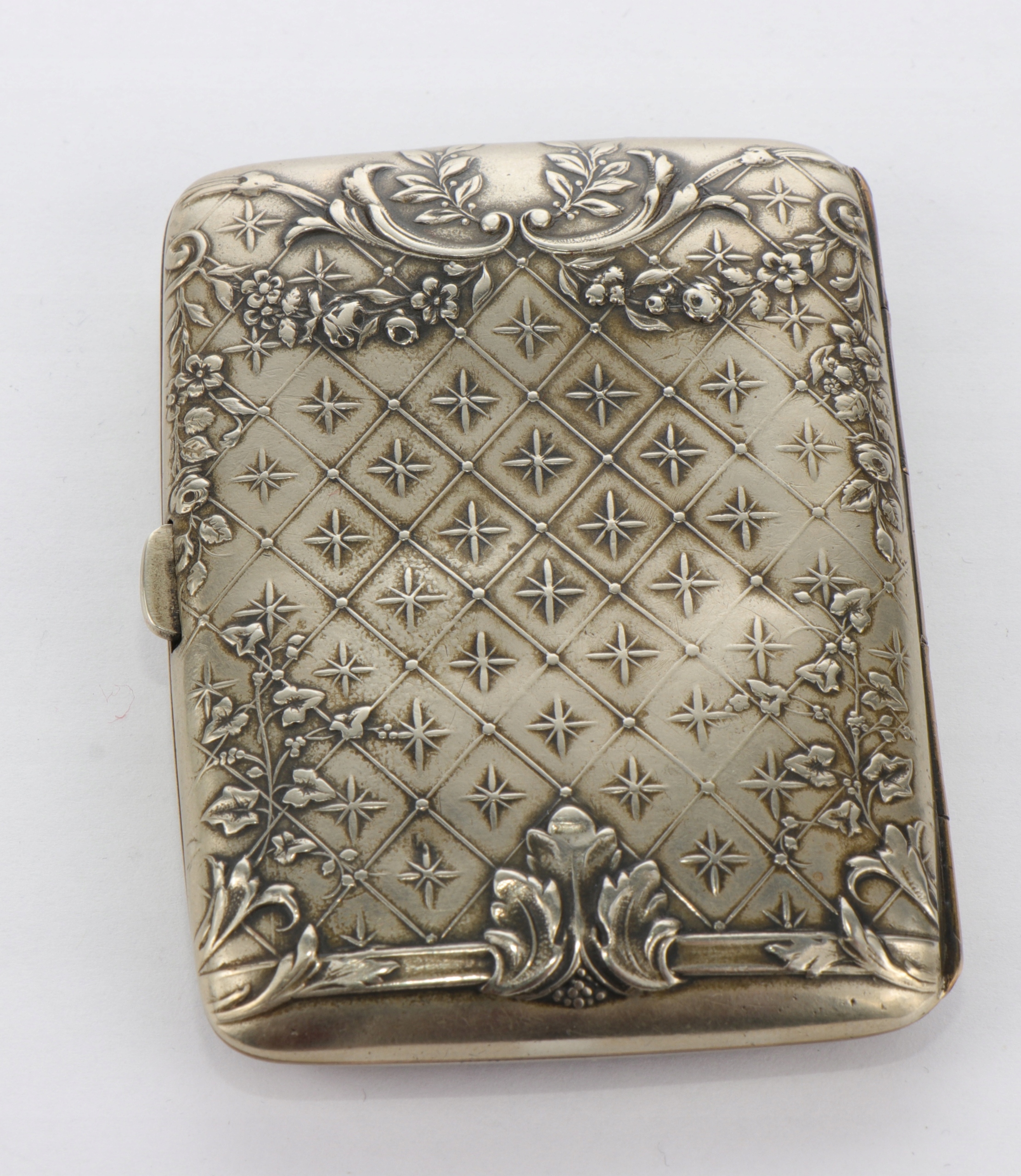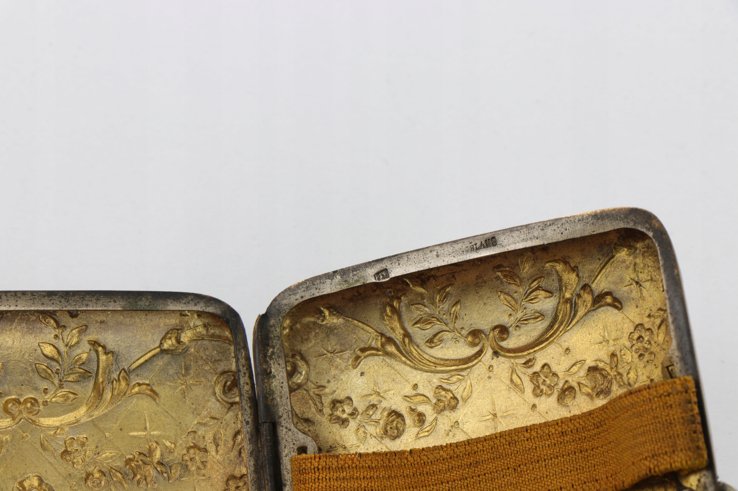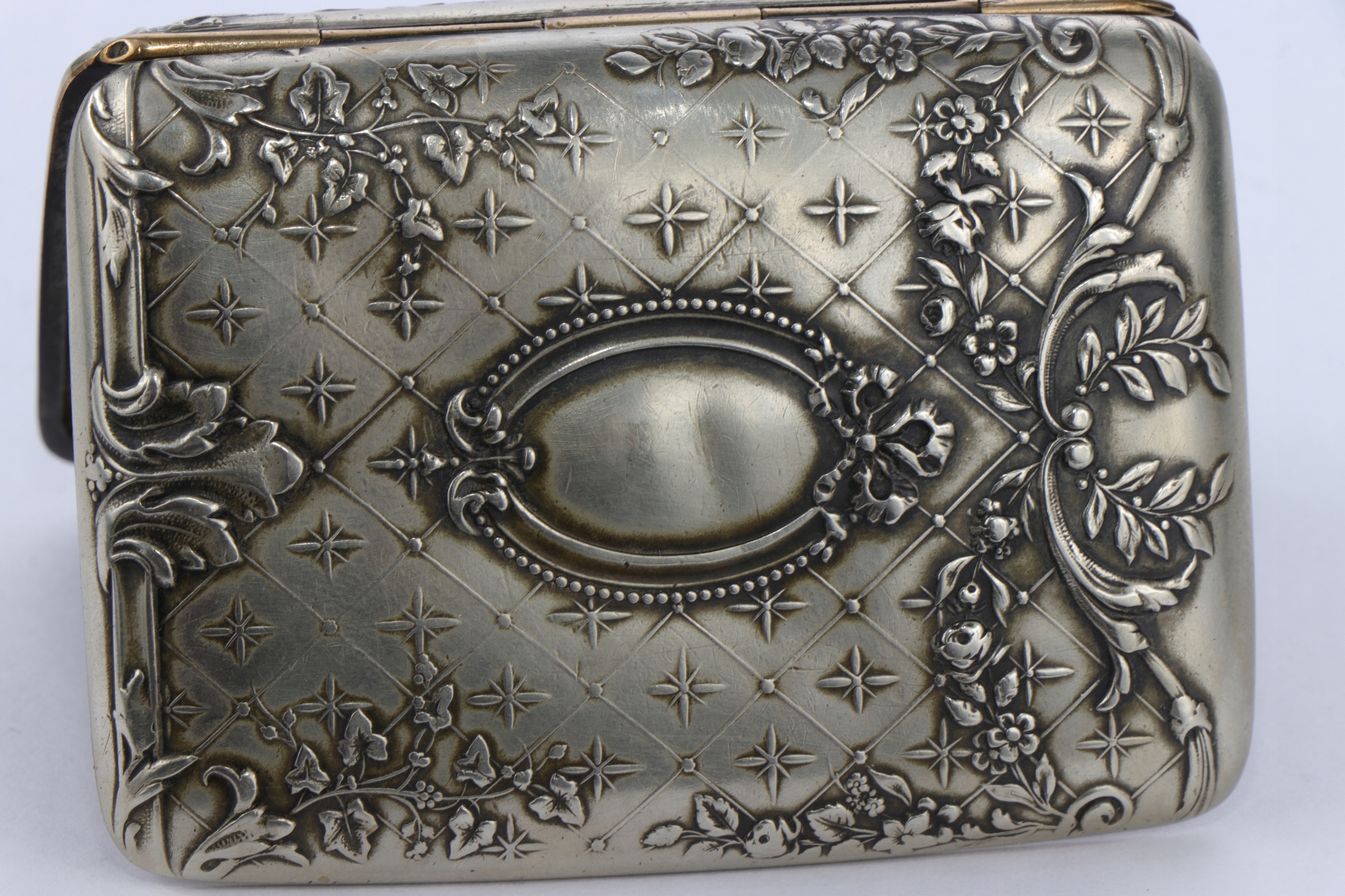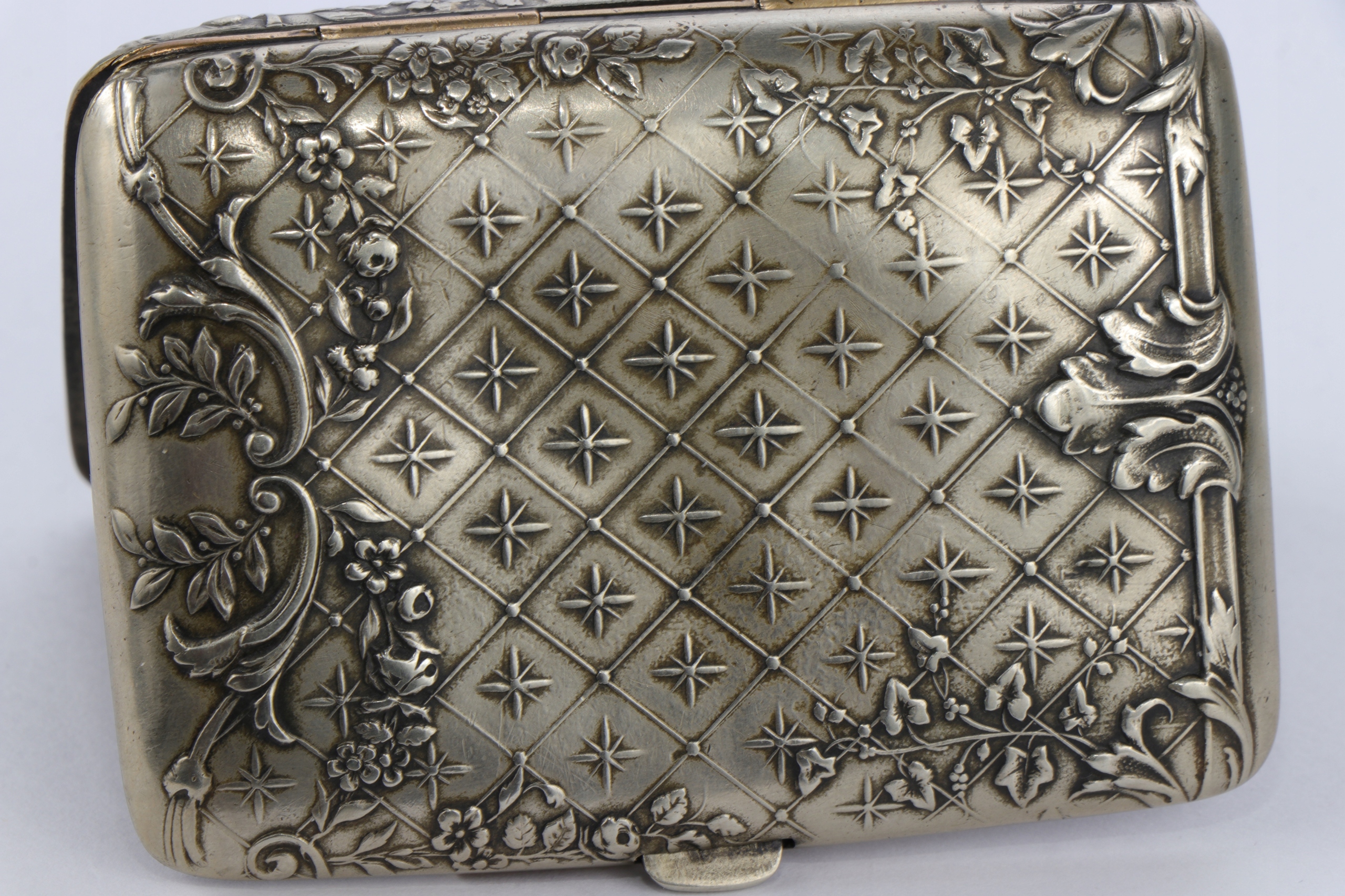 Корпус сигарет, украшенный интересным очень богатым орнаментом цветочных гирляндов и листьев акантуса. Металлический металлический сплав Blanc. Подписанный.