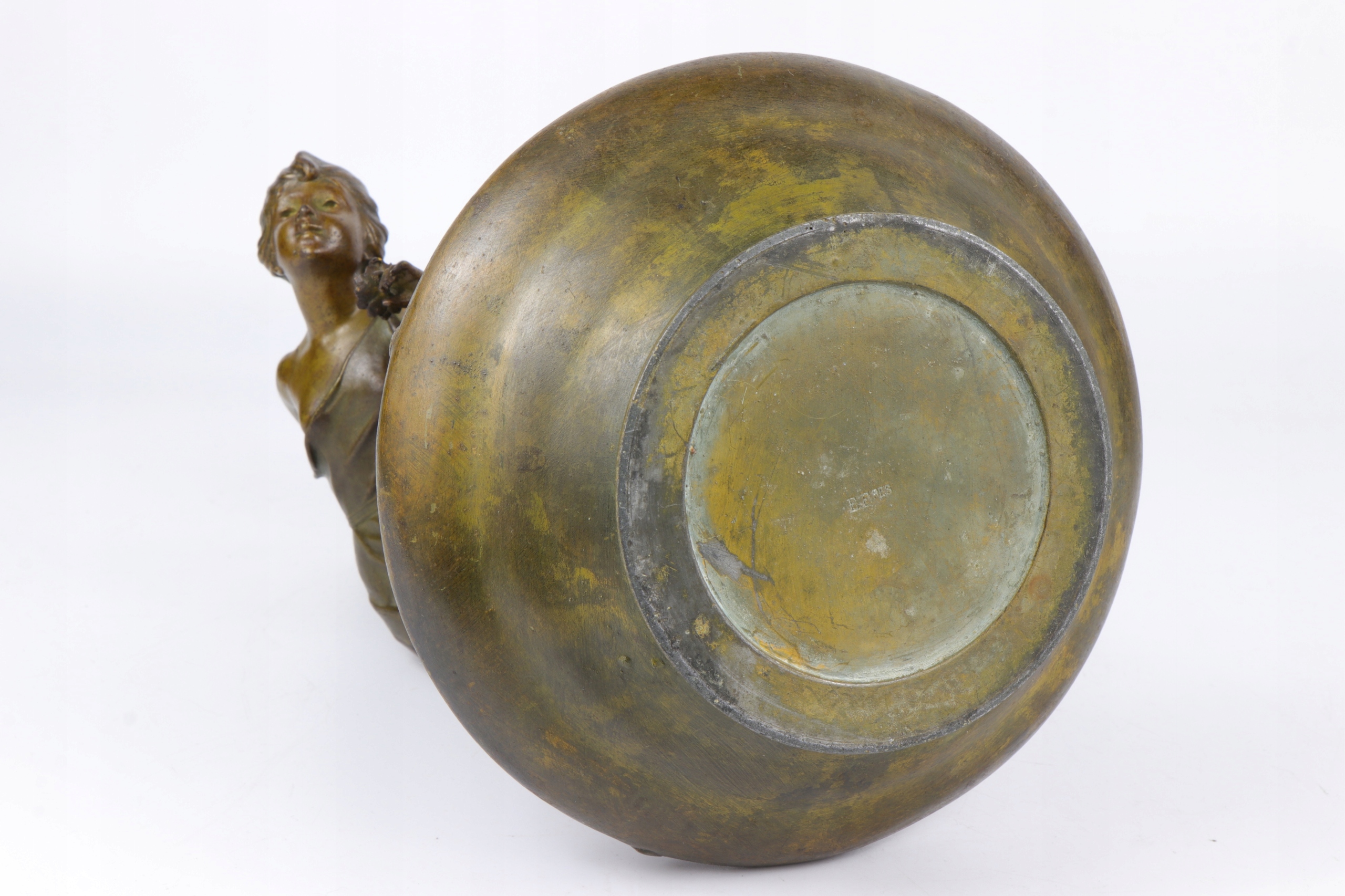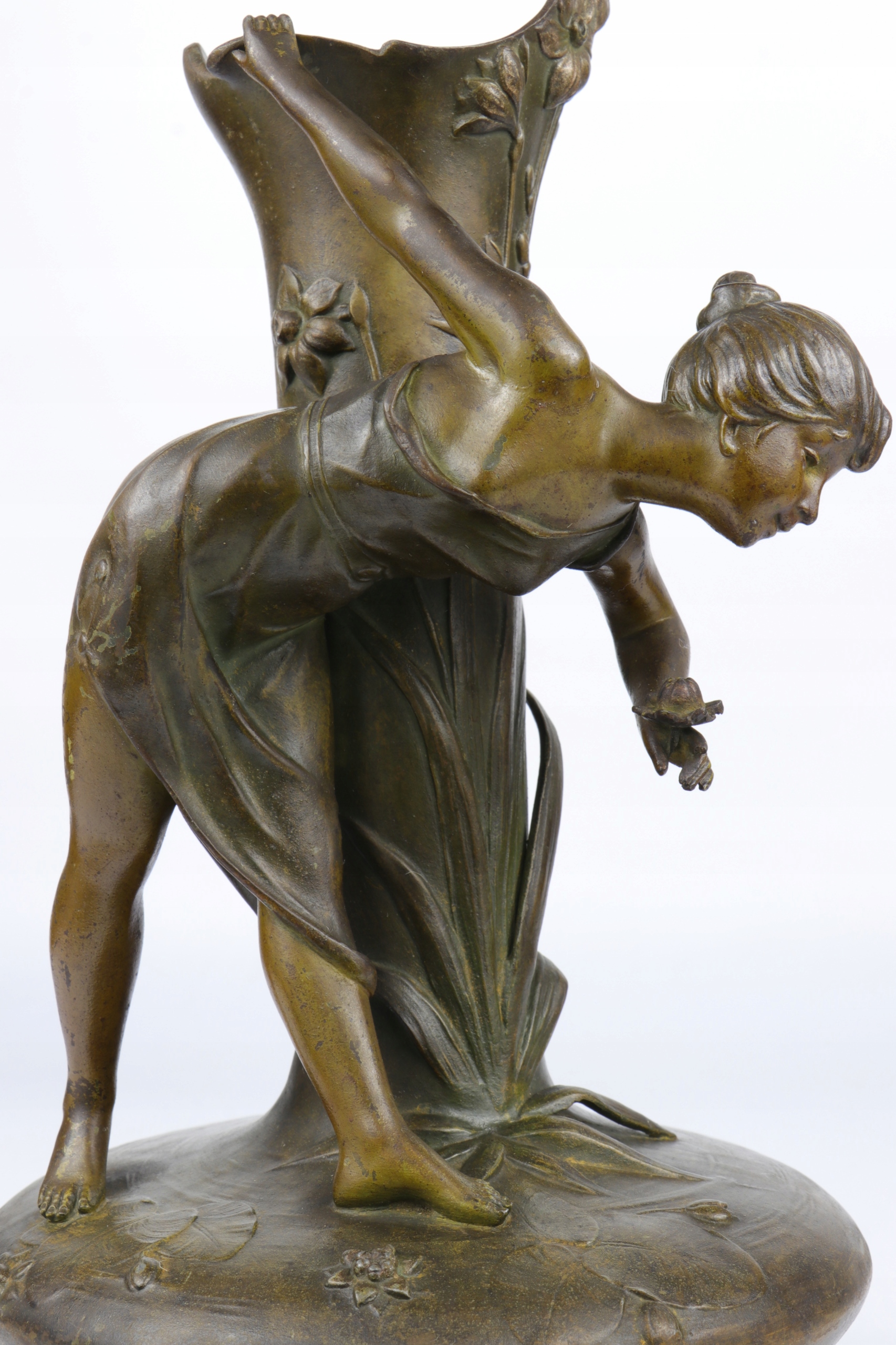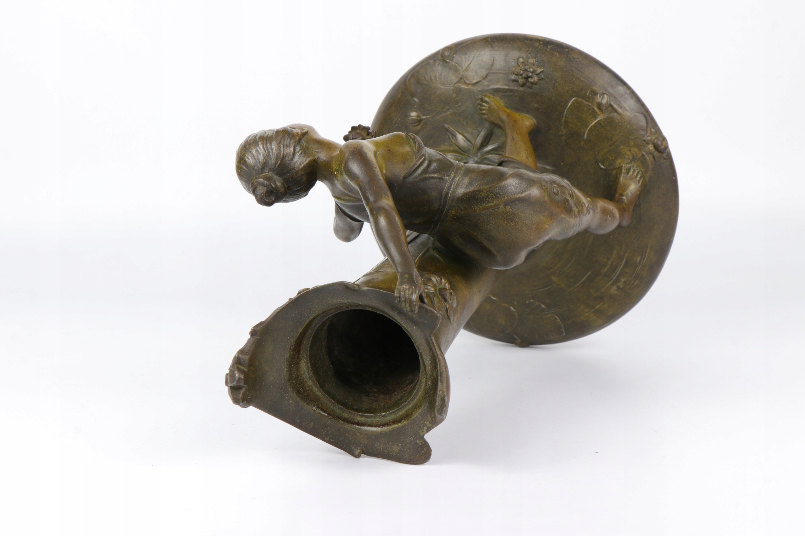 Фигурная ваза в стиле модерн с клеймом литейного завода. Ваза с красиво вылепленной фигурой молодой женщины, идущей по широкому нижнему брюху вазы. Ваза без авторской подписи, дизайн Элси Томас Уорд Геринг 1872-1923 гг. Американская художница, известная многочисленными работами и проектами в стиле модерн.