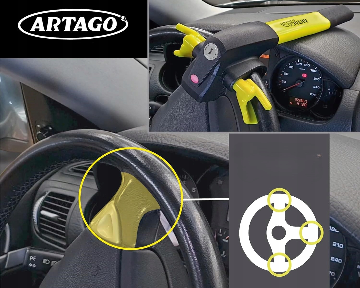 - Практический и прост в использовании: благодаря эксклюзивной системе нажатия и щелчка, блокировку рулевого колеса автомобильного рулевого колеса можно заблокировать быстрее без ключа. Открытие удобнее благодаря передней позиции ключа. Шормозренные руки полностью прорезины, чтобы избежать повреждения рулевого колеса. Artago 870 оснащен сменным высокотехнологичным электронным модулем (в случае других вам необходимо тратить весь замок, если в будущем у вас возникнут проблемы со встроенной электроникой).