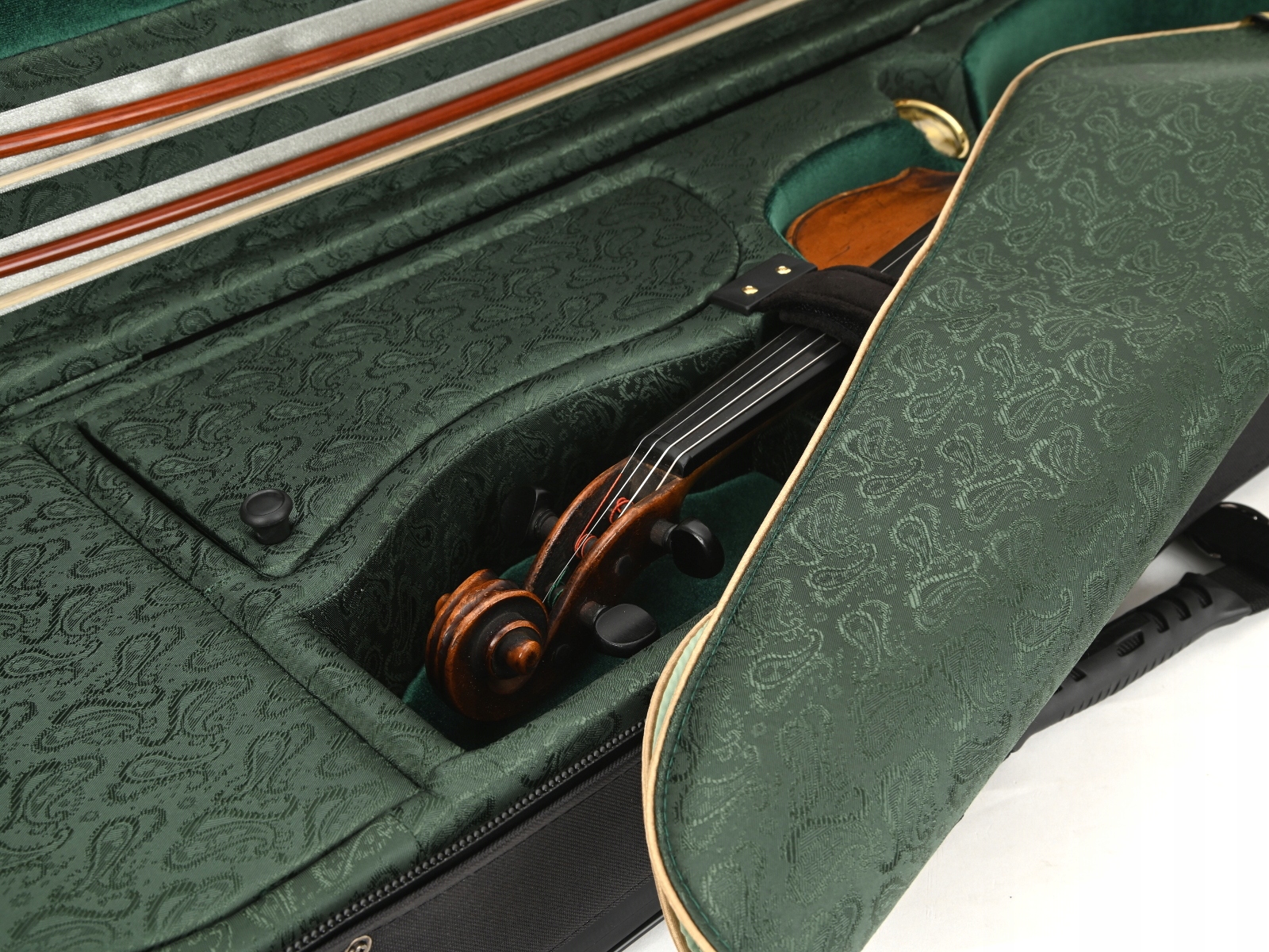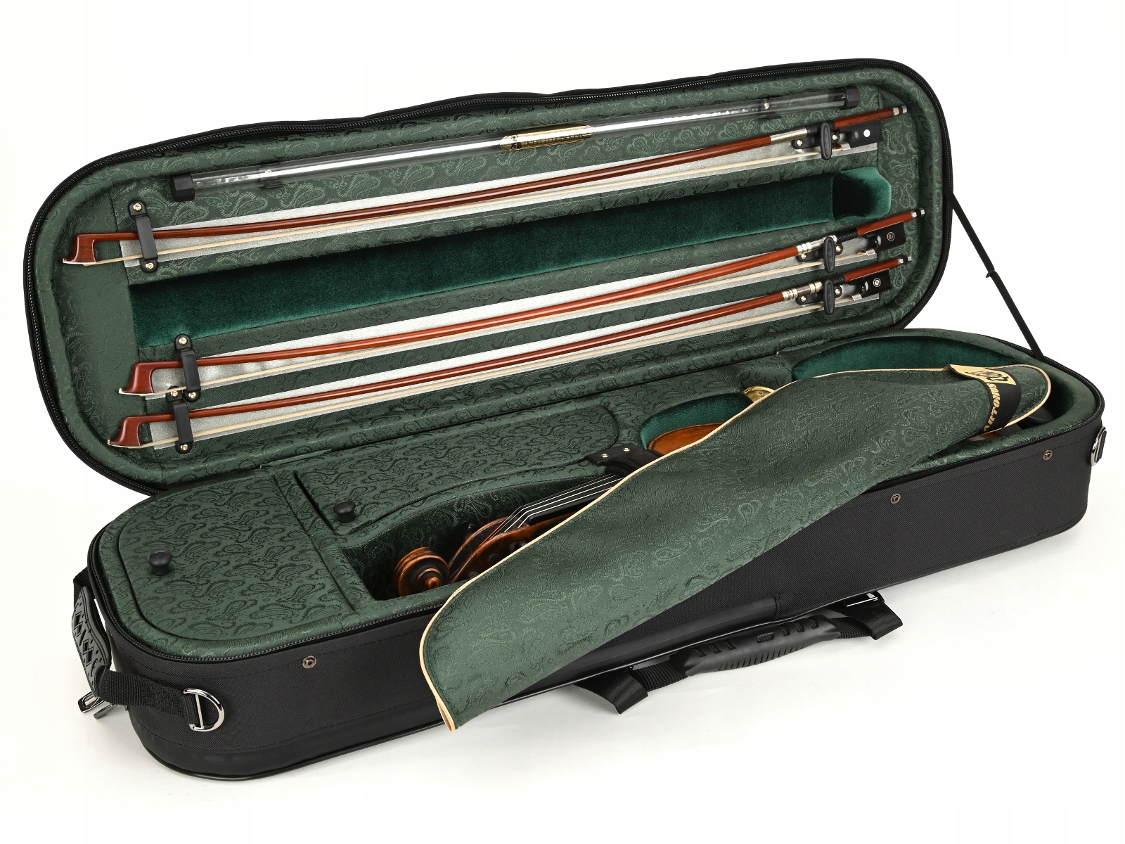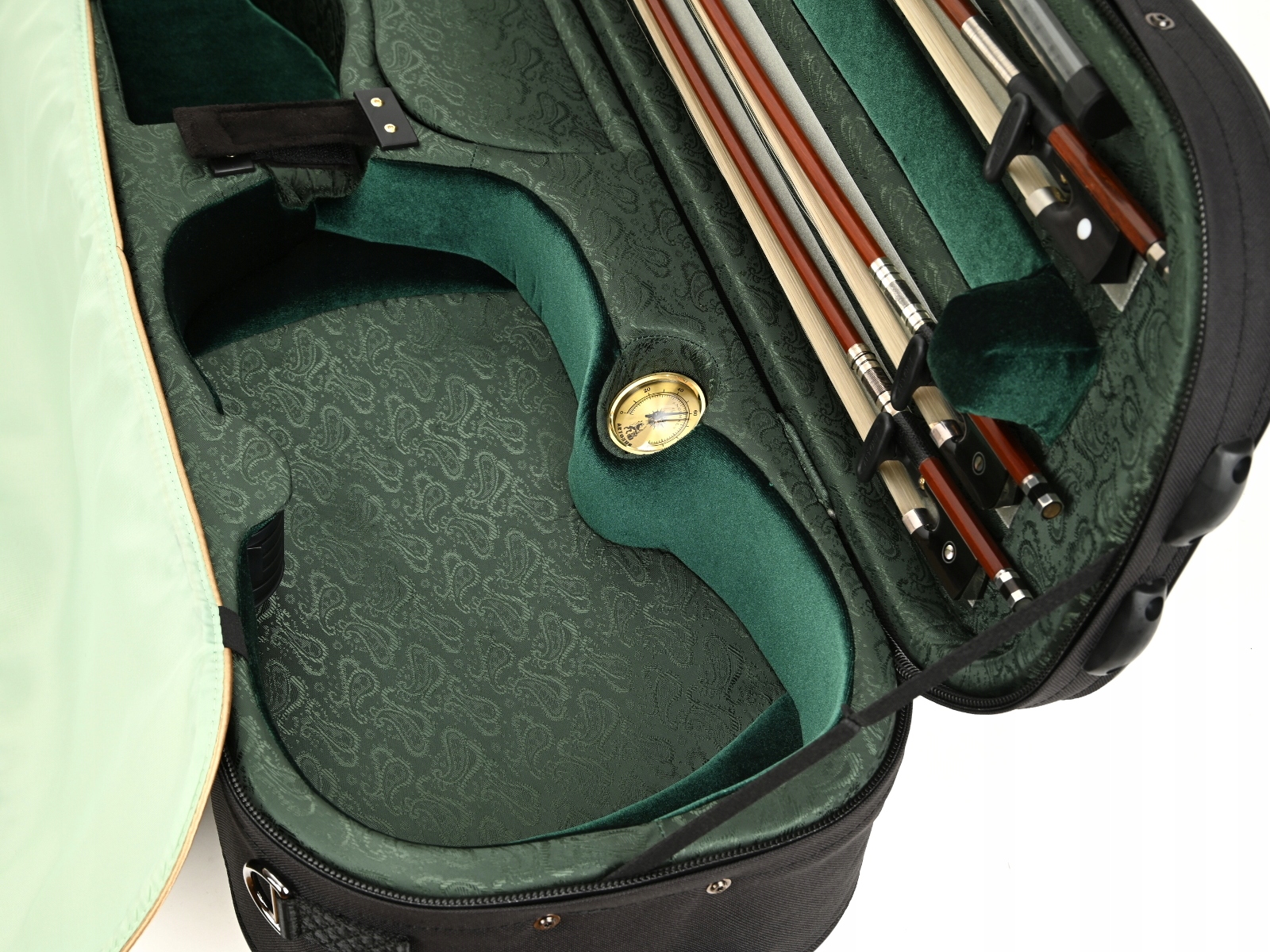 Внутренняя часть облицована жаккардовой тканью и бархатом с черной и золотой фурнитурой. В футляре для скрипки есть место для трех смычков и специальное отделение для смычков большего размера. Мы рекомендуем его для инструментов, размеры которых немного больше стандартных. Гигрометр и увлажнитель располагались симметрично по обе стороны звуковой коробки скрипки. Как и каждый футляр для скрипки из этой серии, он имеет карман для нот, не увеличивающий его размер. В комплект также входит запас специальных наполнителей для воды и увлажнителя, а также ремни/подтяжки для удобного ношения кейса на спине.