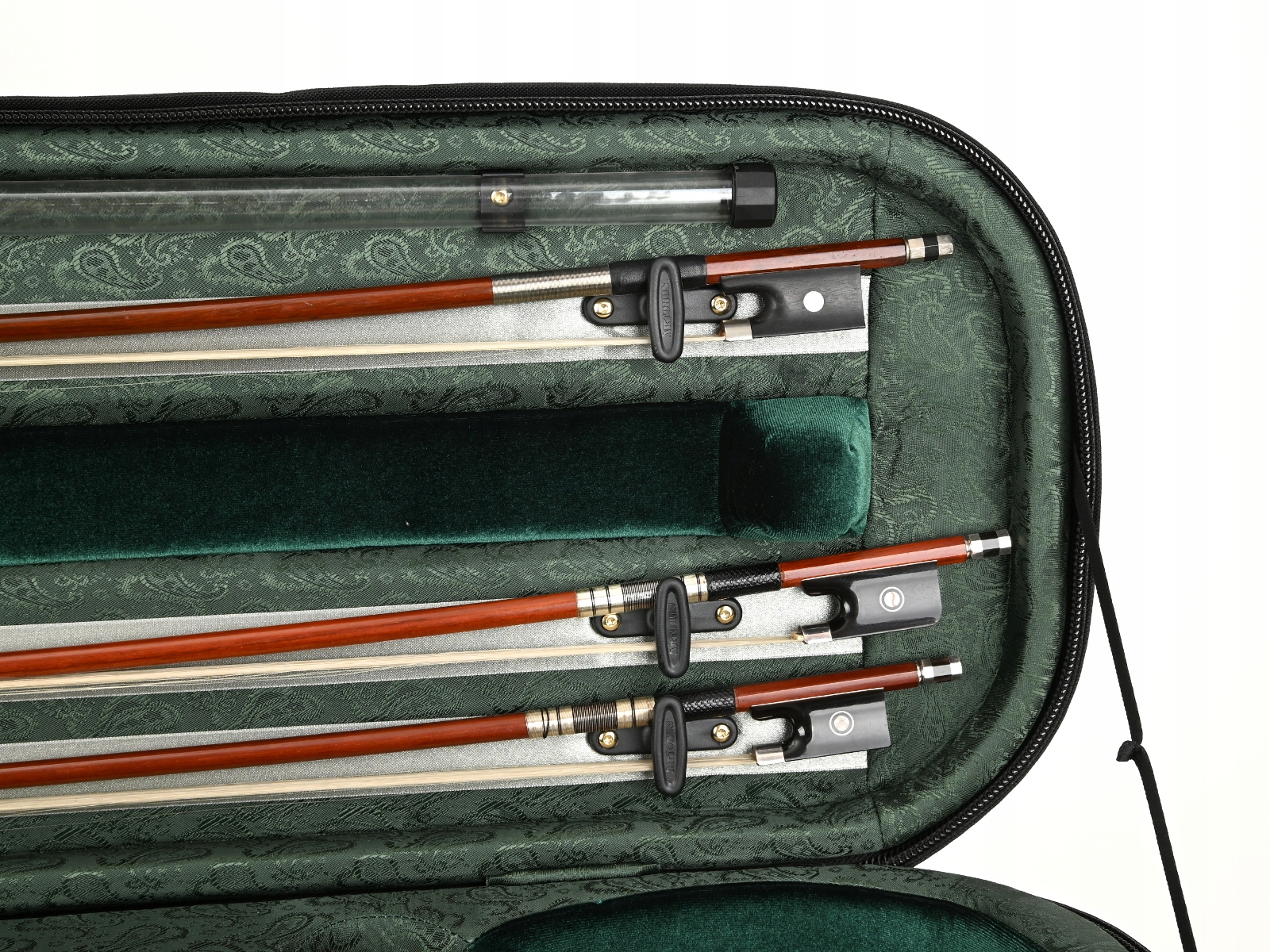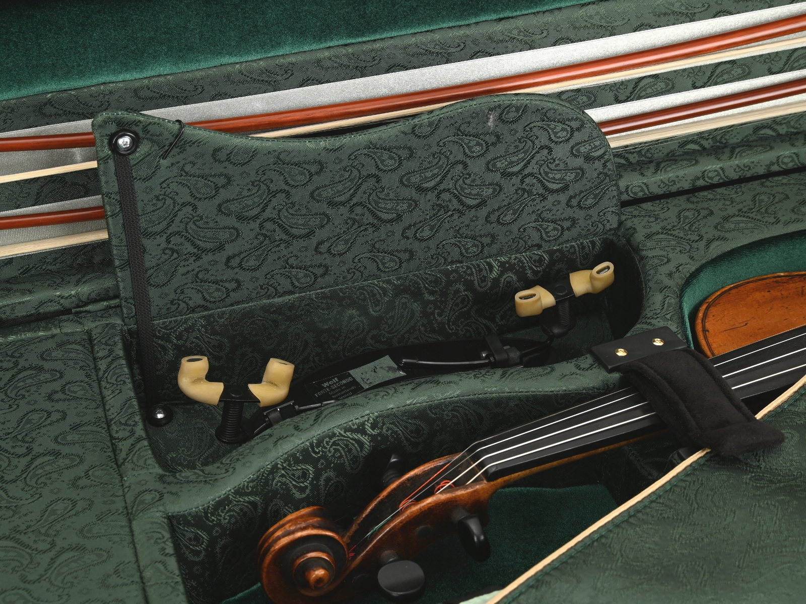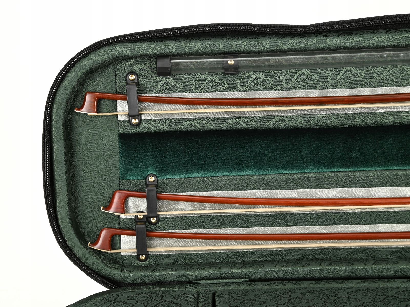 Внутренняя часть облицована жаккардовой тканью и бархатом с черной и золотой фурнитурой. В футляре для скрипки есть место для трех смычков и специальное отделение для смычков большего размера. Мы рекомендуем его для инструментов, размеры которых немного больше стандартных. Гигрометр и увлажнитель располагались симметрично по обе стороны звуковой коробки скрипки. Как и каждый футляр для скрипки из этой серии, он имеет карман для нот, не увеличивающий его размер. В комплект также входит запас специальных наполнителей для воды и увлажнителя, а также ремни/подтяжки для удобного ношения кейса на спине.