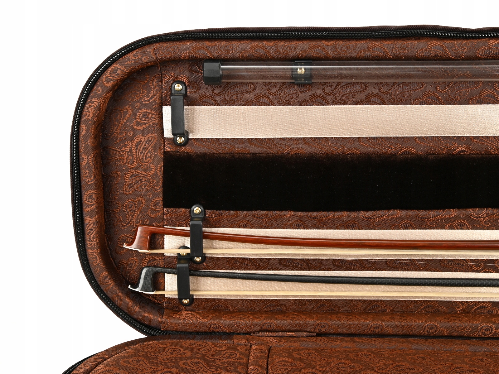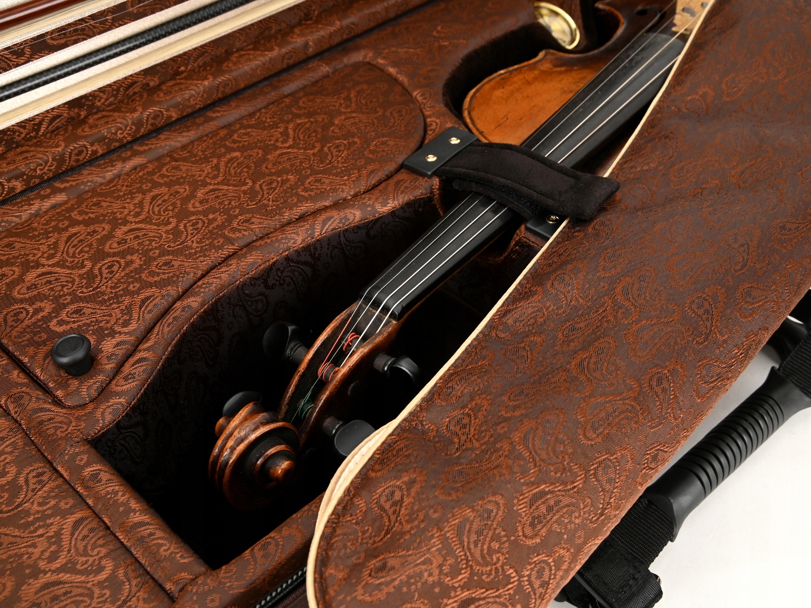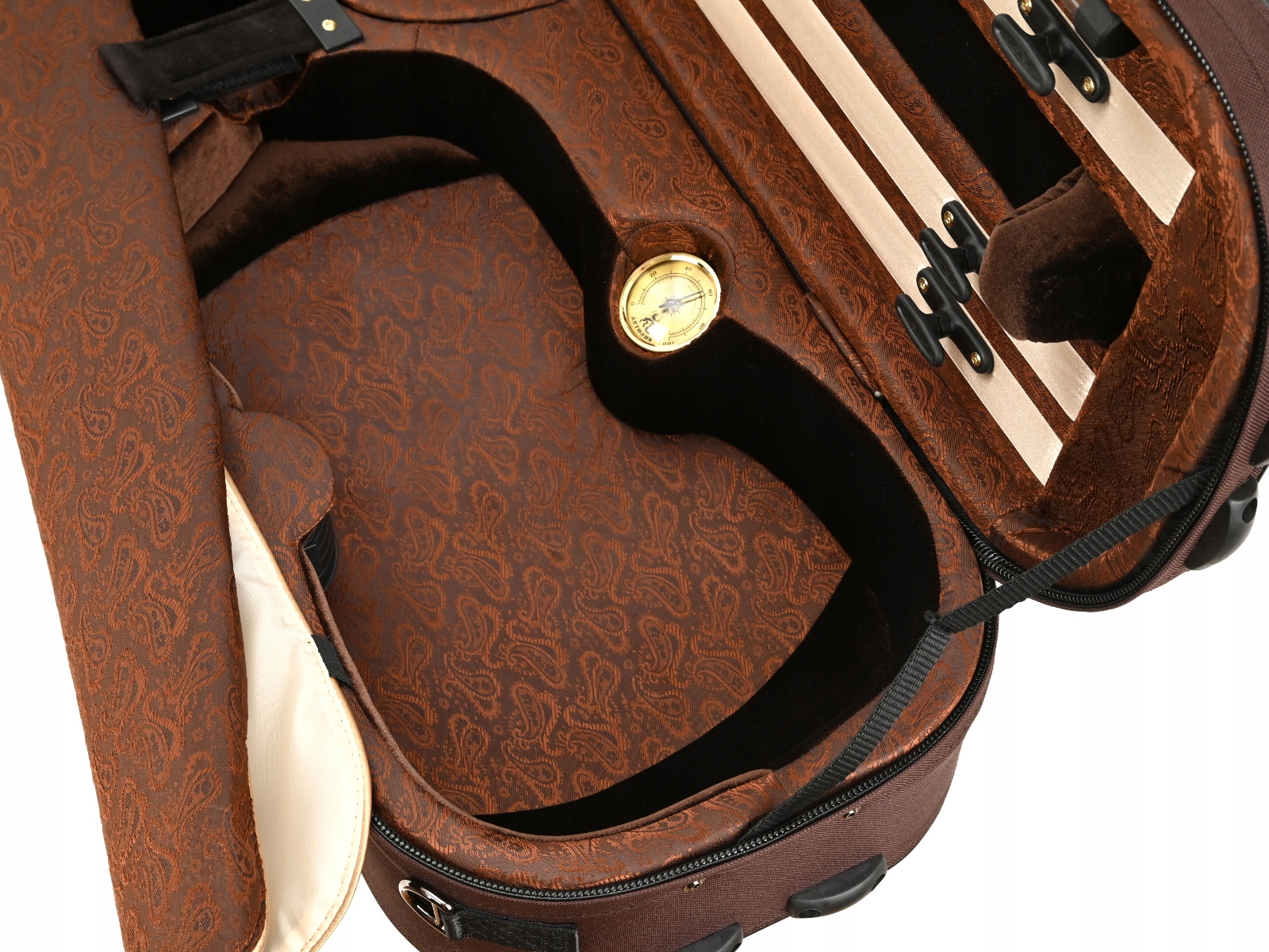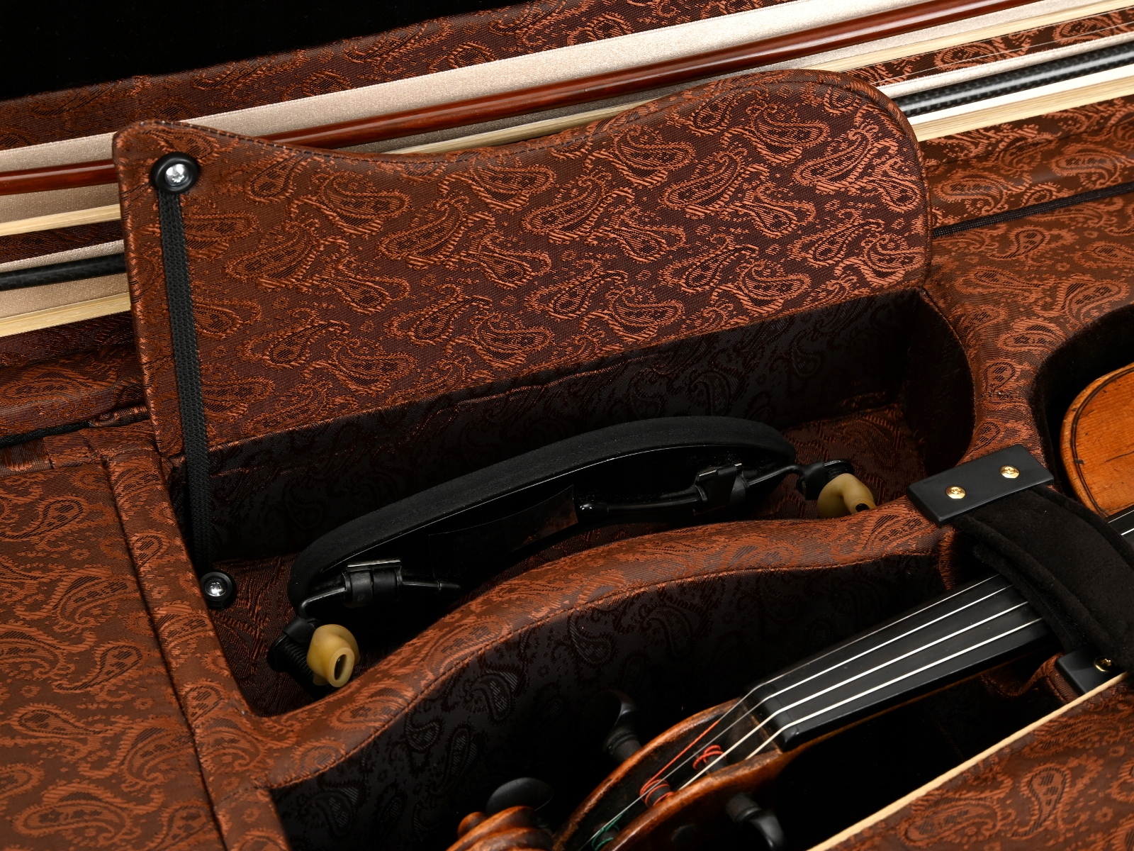 Внутренняя часть облицована жаккардовой тканью и бархатом с черной и золотой фурнитурой. В футляре для скрипки есть место для трех смычков и специальное отделение для смычков большего размера. Мы рекомендуем его для инструментов, размеры которых немного больше стандартных. Гигрометр и увлажнитель располагались симметрично по обе стороны звуковой коробки скрипки. Как и каждый футляр для скрипки из этой серии, он имеет карман для нот, не увеличивающий его размер. В комплект также входит запас специальных наполнителей для воды и увлажнителя, а также ремни/подтяжки для удобного ношения кейса на спине.