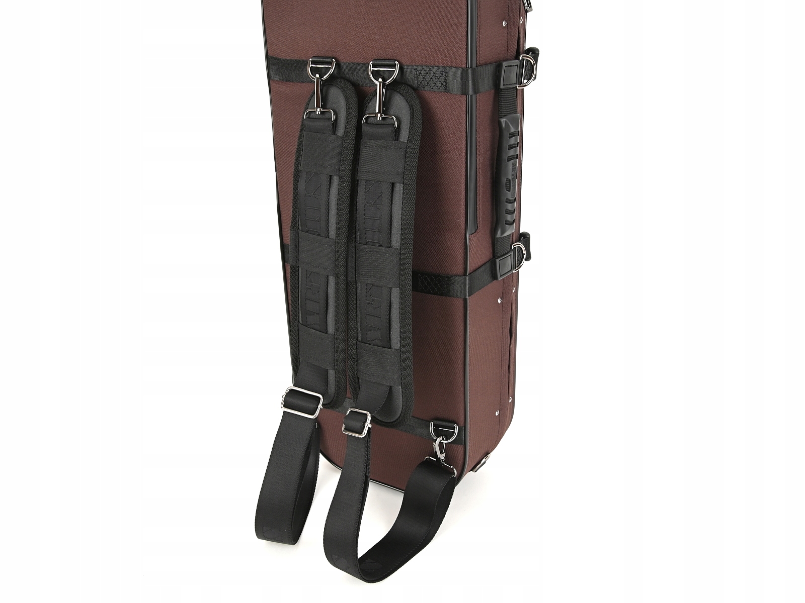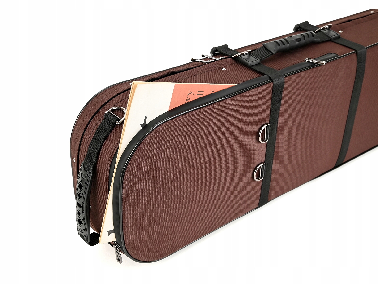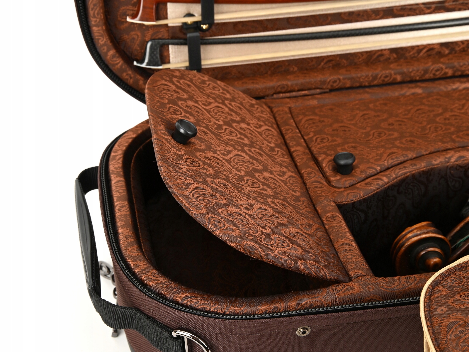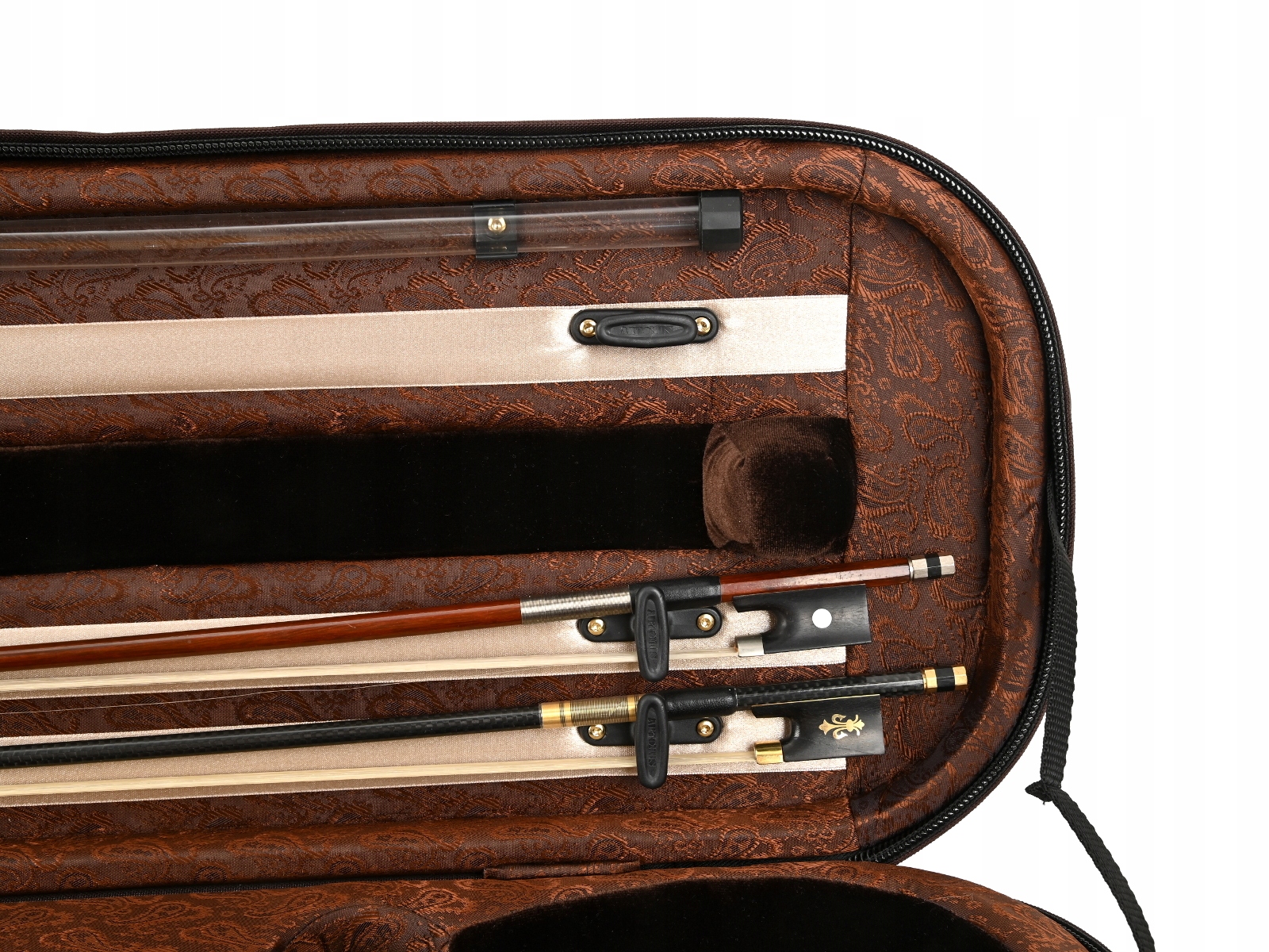 Внутренняя часть облицована жаккардовой тканью и бархатом с черной и золотой фурнитурой. В футляре для скрипки есть место для трех смычков и специальное отделение для смычков большего размера. Мы рекомендуем его для инструментов, размеры которых немного больше стандартных. Гигрометр и увлажнитель располагались симметрично по обе стороны звуковой коробки скрипки. Как и каждый футляр для скрипки из этой серии, он имеет карман для нот, не увеличивающий его размер. В комплект также входит запас специальных наполнителей для воды и увлажнителя, а также ремни/подтяжки для удобного ношения кейса на спине.