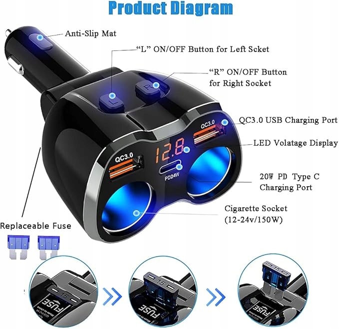 - [Double USB QC3.0 и PD 3.0 20 W] Обновите портативное автомобильное зарядное устройство, двойные порты USB QC3.0, которые могут одновременно заряжать многие совместимые устройства. Скорость 20 в PD3.0 Тип C в 4 раза быстрее, чем в случае традиционной зарядки, общая выходная мощность 7.5 A позволяет быстро заряжать мобильные телефоны, планшеты и GPS. Он уменьшает потребление и продлевает срок службы оборудования, благодаря которой операция проще и безопаснее в использовании. Сплиттер 12 В может гибко вращаться на 90 ° спереди и сзади, а автомобильное зарядное устройство USB C может быть отрегулировано, что удобнее использовать. Когда напряжение слишком высокое или слишком низкое, светодиодный дисплей начнет мигать цифровой сигнализации. Портативный USB LIGHER имеет встроенный светодиодный свет, даже в темной обстановке, вы можете легко найти зарядный порт.