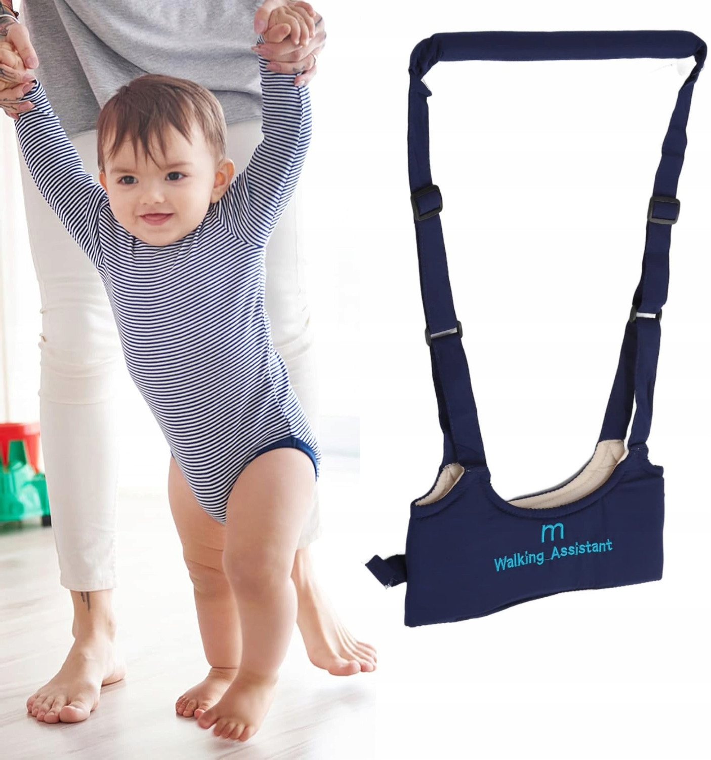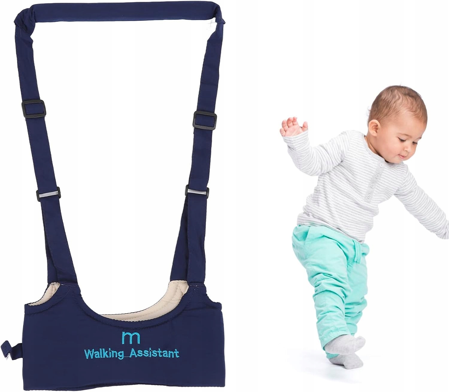 Регулируемый: шарф ходунка оснащен регулируемыми скобками и защитными зажимами, которые очень легко надеть и взлететь, а также адаптируются к форме тела ребенка.