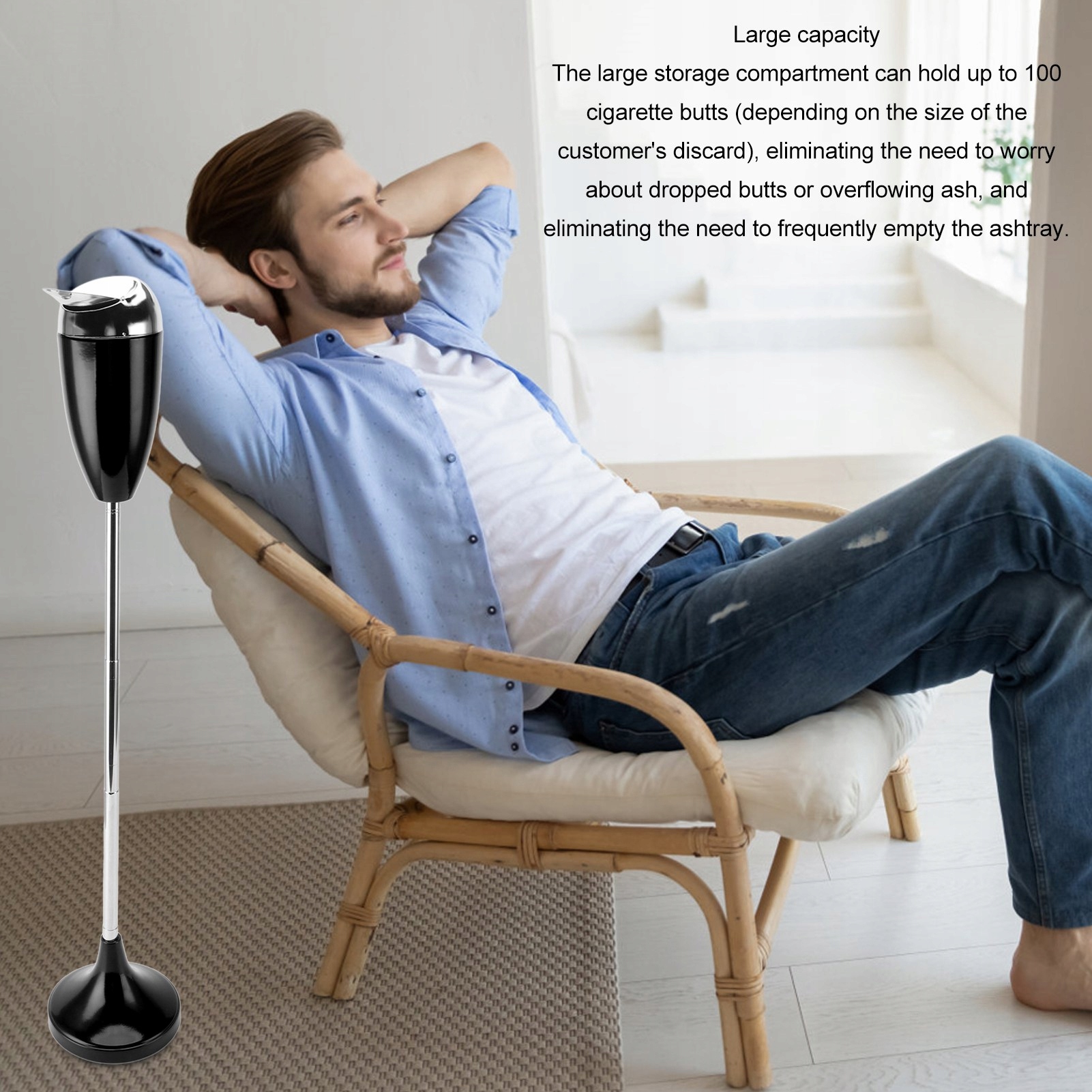 2. Регулируемая высота: телескопическая палочка имеет регулируемую конструкцию, которую можно свободно и гибко отрегулировать. Вы можете выбрать высоту пепельницы, которую хотите адаптироваться к своим потребностям. Большая обремененная база гарантирует, что стабильность и предотвращает опрокидывание, идеально подходит для внешнего использования.