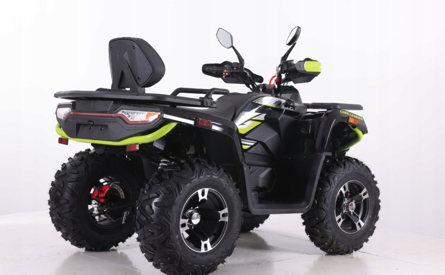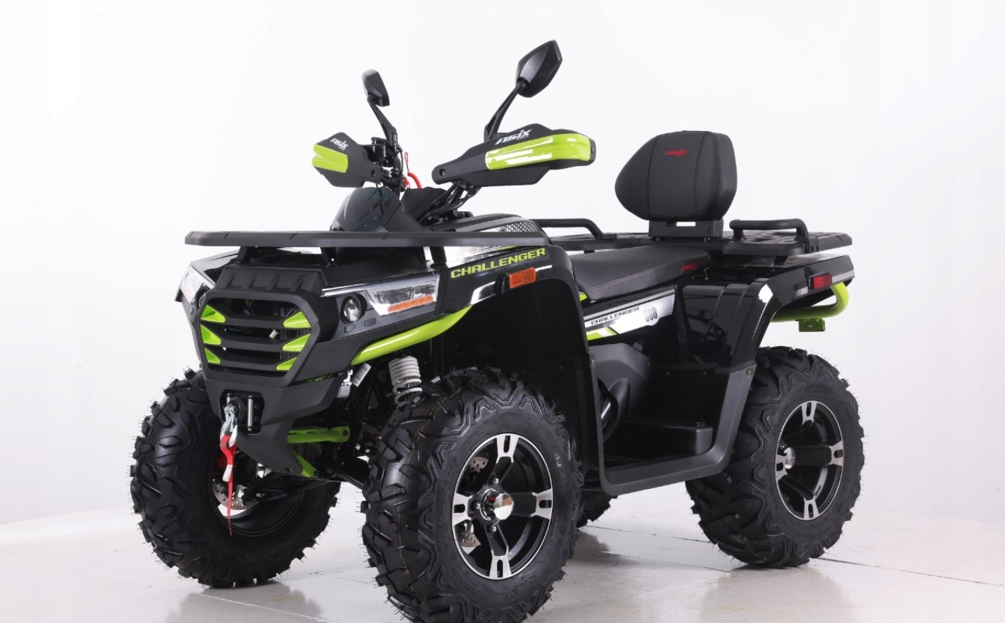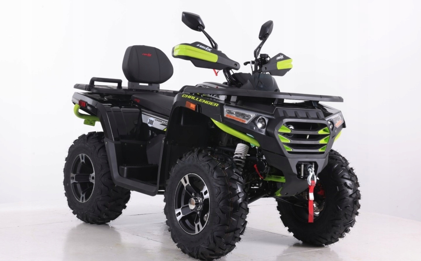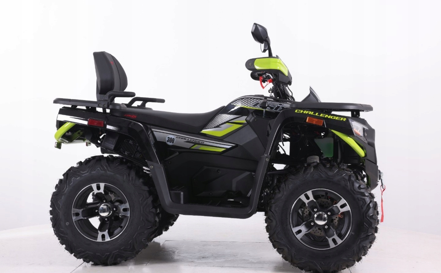 Challenger 300 - это транспортное средство с одобрением дороги в качестве сельскохозяйственного трактора (двойное утверждение). Приводной блок представляет собой жидкий жидкий двигатель Loncin 270 см3 Loncin. Привод передается валом кардана. Квадрат большого размера объединяется на 12-дюймовых алюминиевых ободах. Автомобиль имеет автоматическую коробку передач с двумя режимами движения вперед (L-Wole, H-FAST). Основные элементы оборудования, среди прочего: светодиодное освещение, 3000 фунтов, лебедка, крючок с электрическим гнездом, USB -гнездами, спинками и пассажирскими ручками