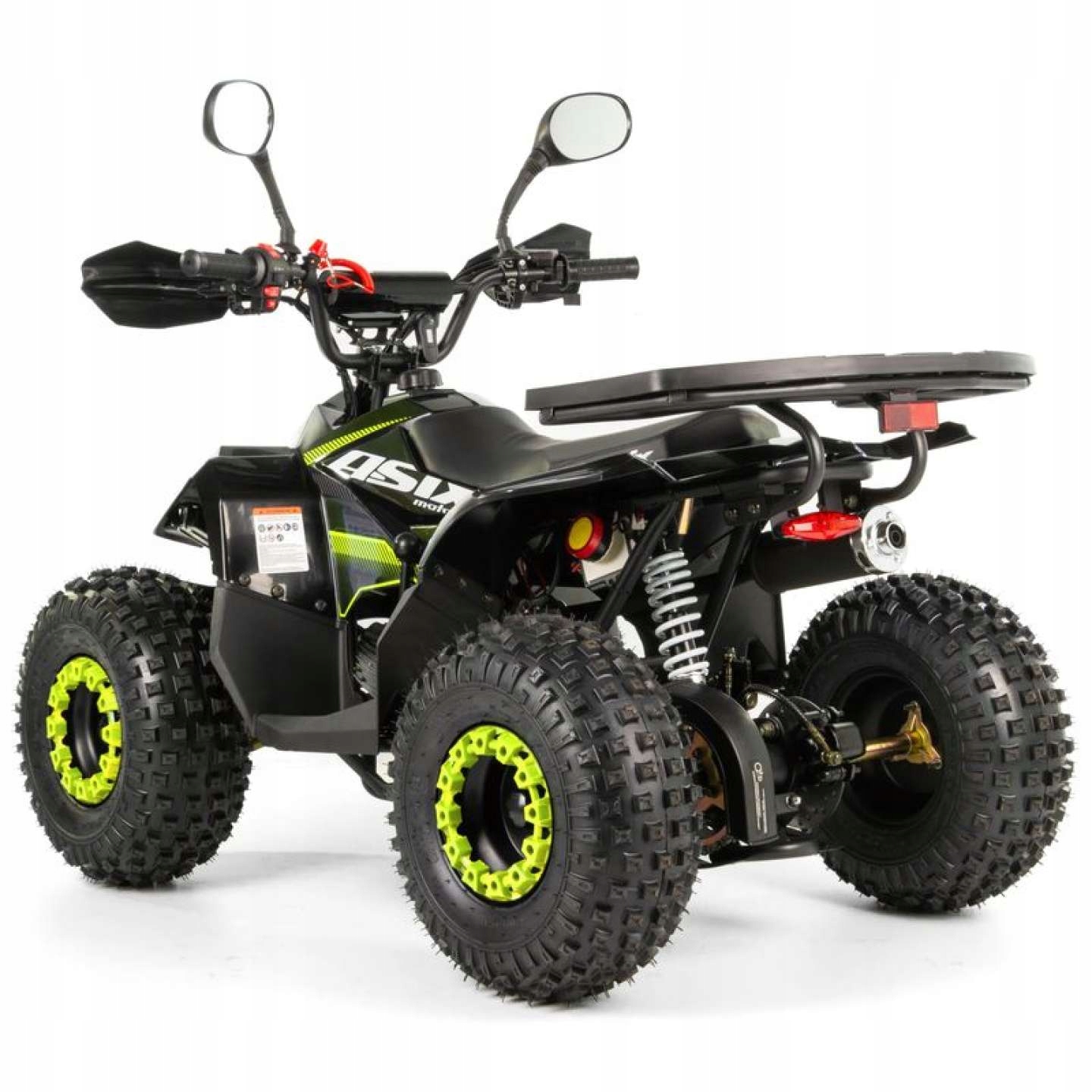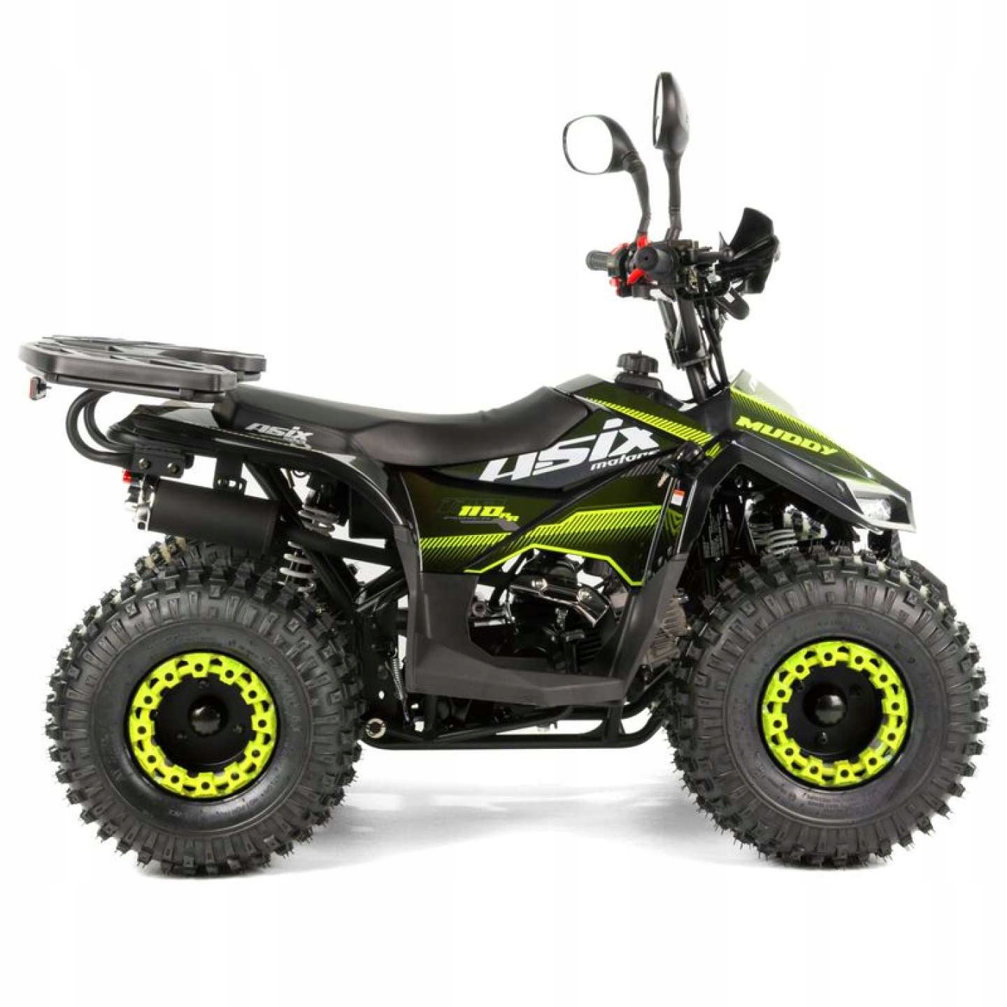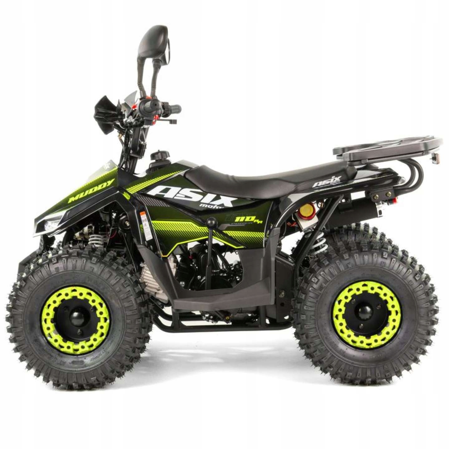 Quad Asix Muddy -это транспортное средство, выпущенное для электрического стартера, с четырехбольным двигателем 110 см3 для детей с 5 лет. Спортивный квадроцикл с передним/задним освещением, обратной передачей, кончиком безопасности и регулировкой скорости на 7 "