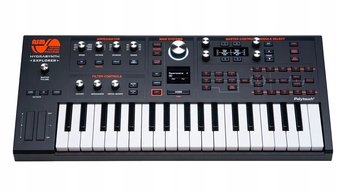 Используя расширенную волновую механизм синтеза, 3 генератора, двойные волновые мутаторы и 2 фильтра, которые можно настроить последовательно или параллельно, возможность генерирования звука несравнена. Explorer имеет клавиатуру Polytouch ™ среднего размера 37 новой среднего размера, которая предлагает полифоническую AfterTouch для каждой ноты, что дает вам своего рода выразительный контроль, обнаруженный только в некоторых винтажных синтезаторах. ASM Polytouch®, полуразмерная пластина среднего размера, которая позволяет использовать как скорость включения/выключения, так и Aftertouch, а также полную полифоническую Aftertouch.
