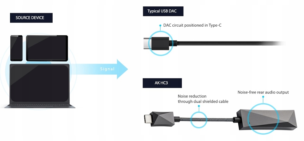 Однако в AK HC3 цифровые сигналы от устройства проходят через кабель с двойным экраном в аудиосхему перед преобразованием в аналоговый сигнал цифро-аналоговым преобразователем. Обработка цифрового сигнала после завершения обеспечивает превосходный звук без шумов по сравнению с другими продуктами USB DAC.