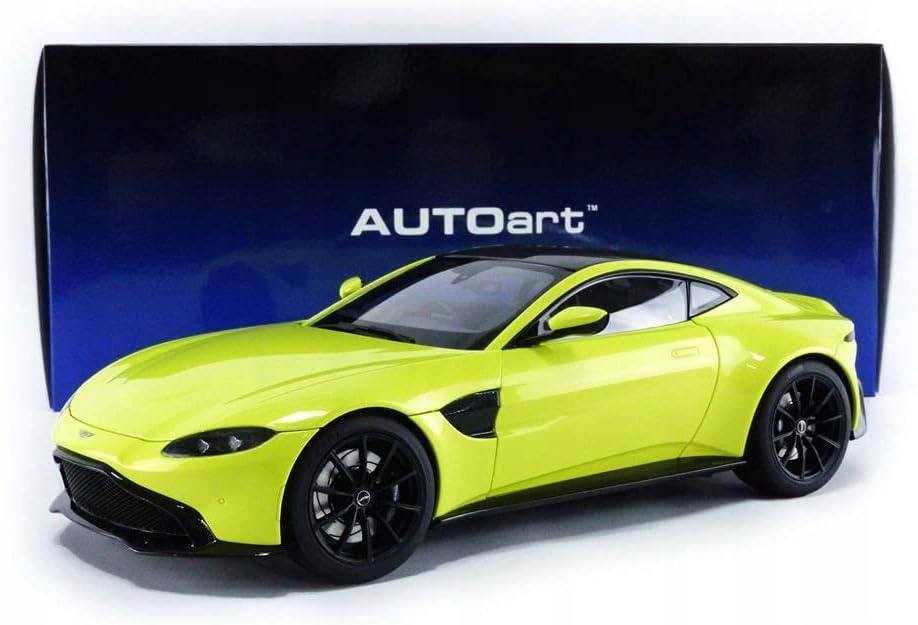 Это модель автомобиля Aston Martin Vantage 2019 года в масштабе 1:18 в цвете Lime Essence. Его выпустила компания AUTOart, известная производством качественных моделей автомобилей из металла. Модель изготовлена из композита металла и пластика, имеет открывающиеся двери, капот и багажник. Салон детальный, с мягким ковровым покрытием и работающим рулем. Экстерьер также детализирован, с точной прорисовкой, эмблемами и колесными дисками.