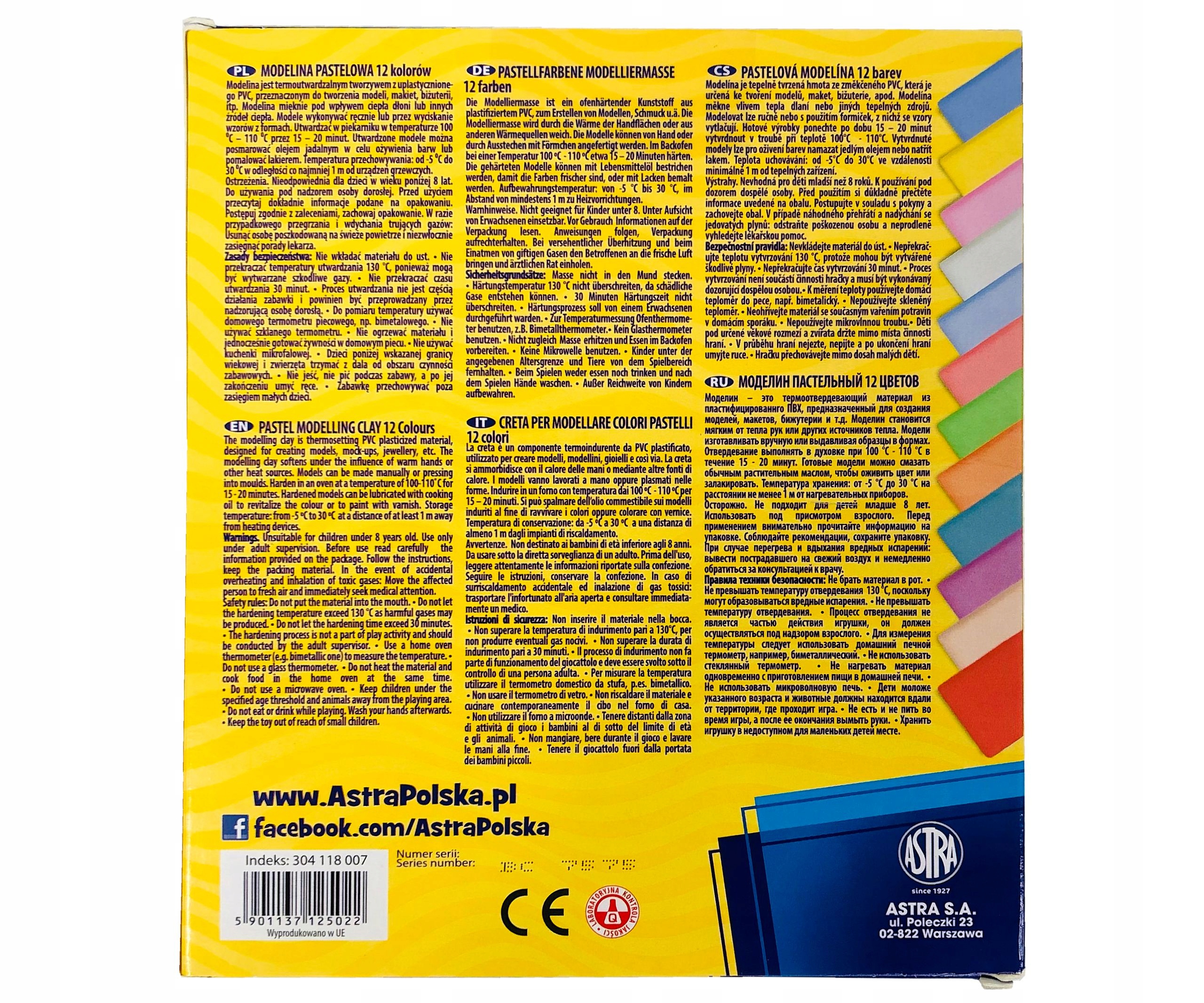 Оплачивая «ASTRA ШКОЛЬНАЯ ПАСТЕЛЬНАЯ ГЛИНА 12 ЦВЕТОВ», вы можете быть уверены, что данное изделие из каталога «Пластилин, полимерная глина» будет доставлено из Польши и проверено на целостность. В цене товара, указанной на сайте, учтена доставка из Польши. Внимание!!! Товары для Евросоюза, согласно законодательству стран Евросоюза, могут отличаться упаковкой или наполнением.