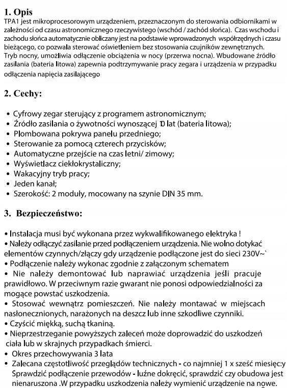 Оплачивая «АСТРОНОМИЧЕСКИЕ ВРЕМЯ, ОДНОКАНАЛЬНАЯ ПРОГРАММА», вы можете быть уверены, что данное изделие из каталога «Безопасность и распределительные устройства» будет доставлено из Польши и проверено на целостность. В цене товара, указанной на сайте, учтена доставка из Польши. Внимание!!! Товары для Евросоюза, согласно законодательству стран Евросоюза, могут отличаться упаковкой или наполнением.